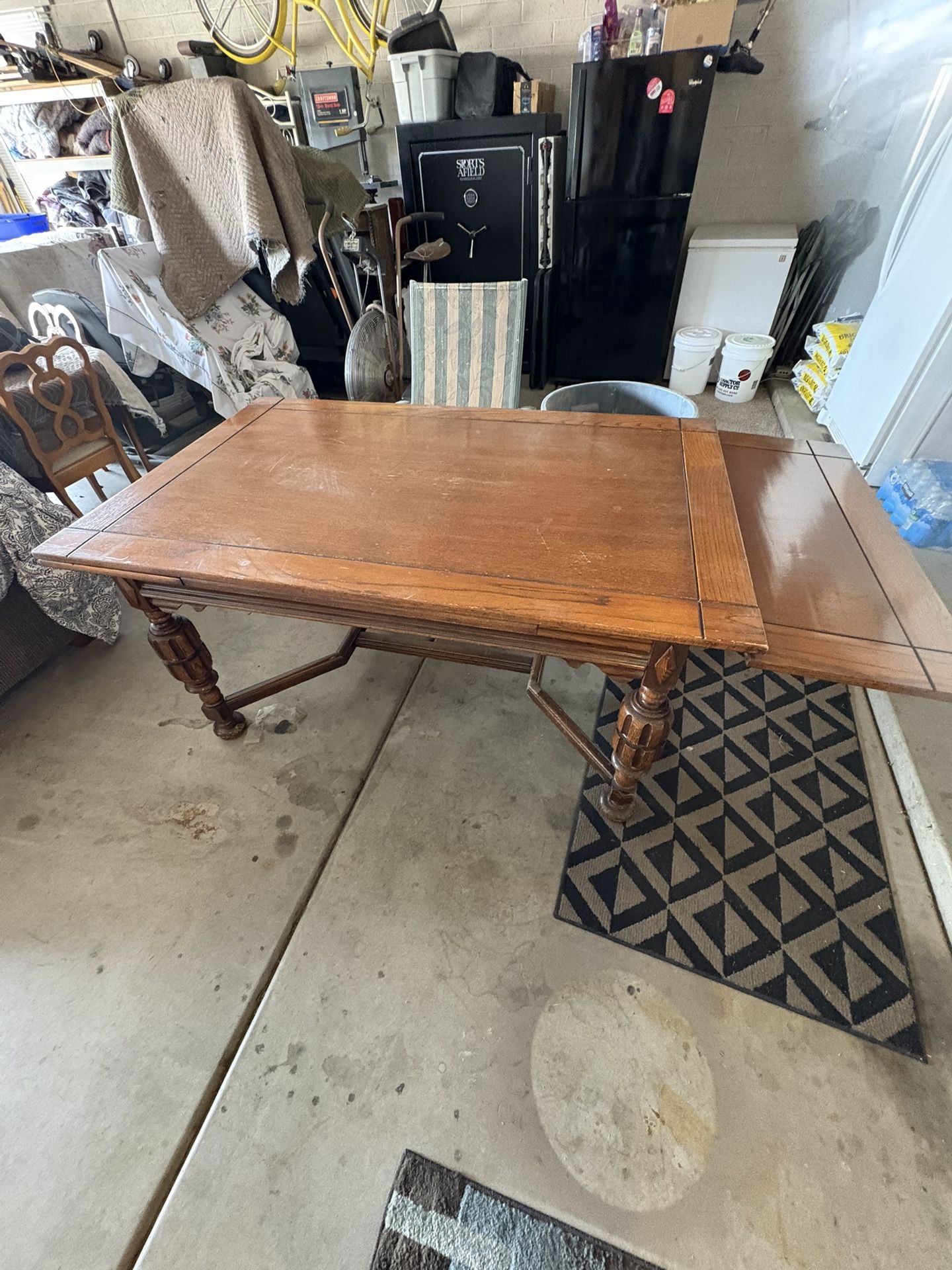 Solid dining table 60x38 with 2-15” pull out leaves. One on each end. (See pics). Can use as is or refinish/ refurbish.