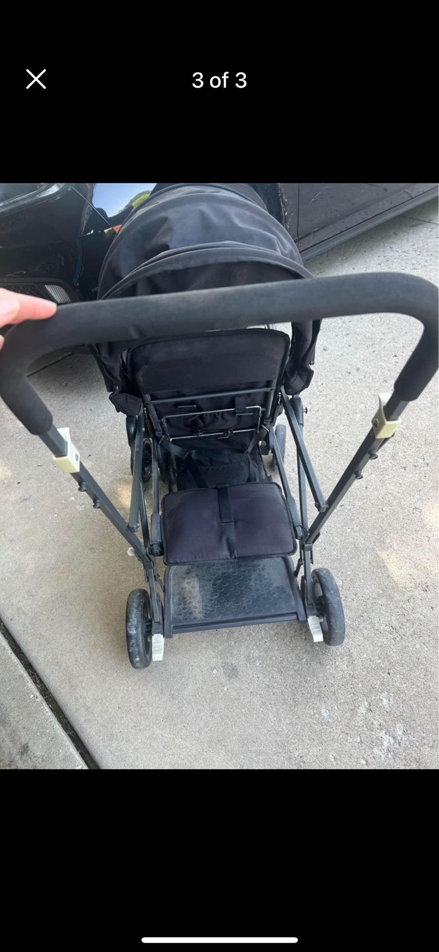 Gently used. Has car seat attachment. Can’t find the tray attachment but you can find one in amazon.