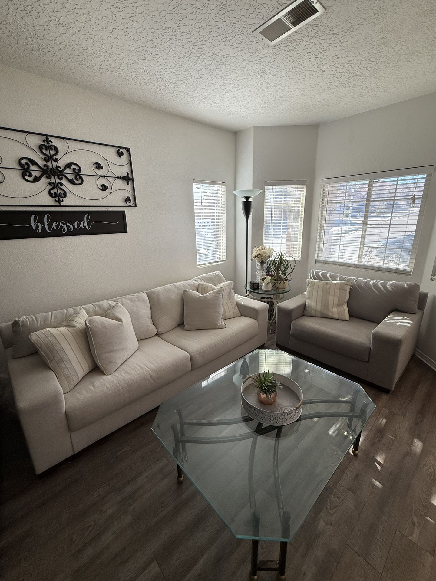 Regular sized couch, & chair and a half for sale (White and grey). Only used for about half a year, in an apartment with just 2 people living there, no pets or animals around. After moving from the apartment, I wrapped the couches and kept it stored safely for about a year.