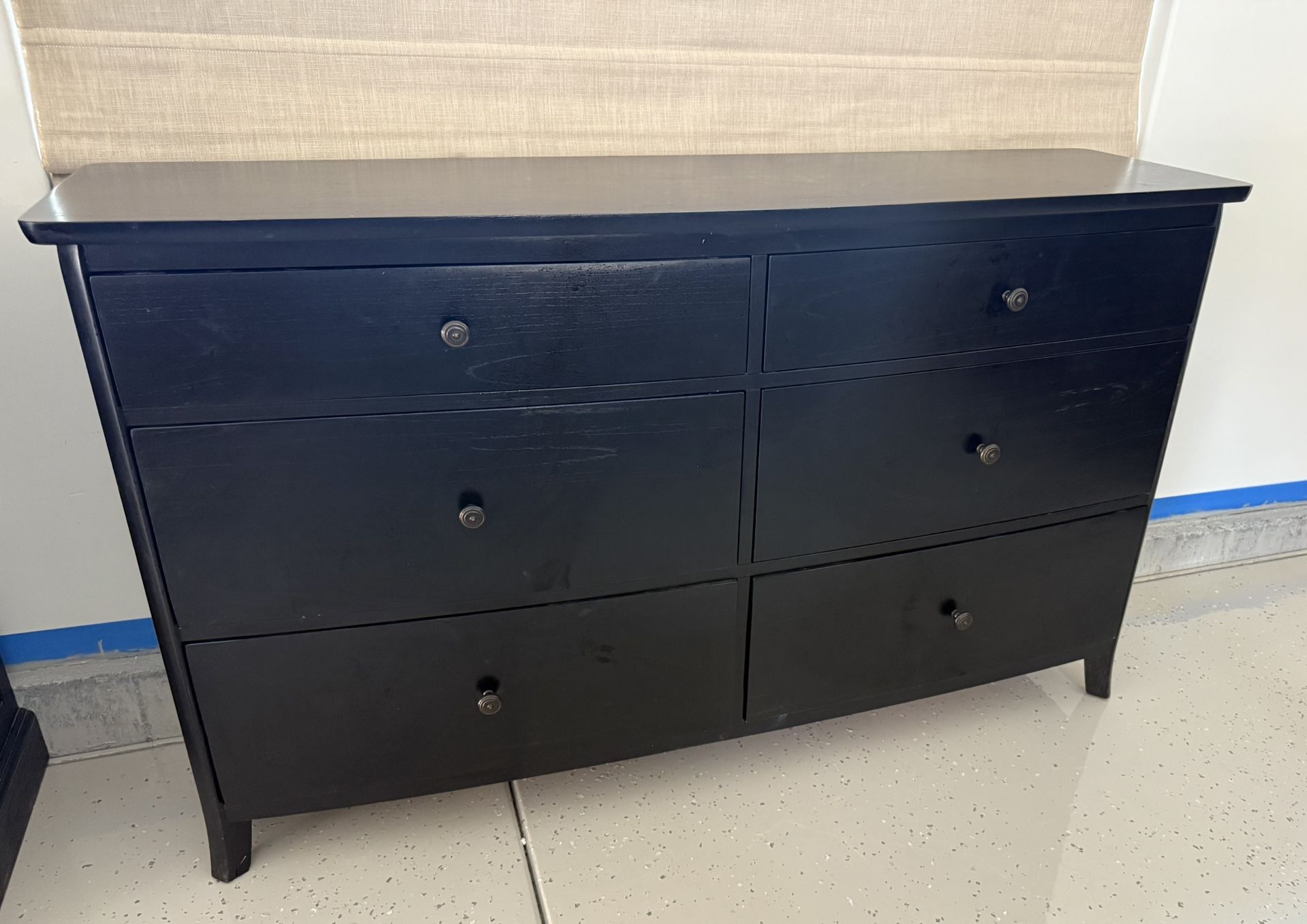 Solid wood, Pottery barn black 6 drawer dresser, Chloe. In great condition. Moved and doesn’t fit in new home. Almost new condition. Very minor pin of nail nicks on the top. Bottom left leg has small chip from moving but is still attached. Drawers glide very smoothly, quality drawer slides. Dimensions in last pic. 62 width, 18 depth, 36 height
