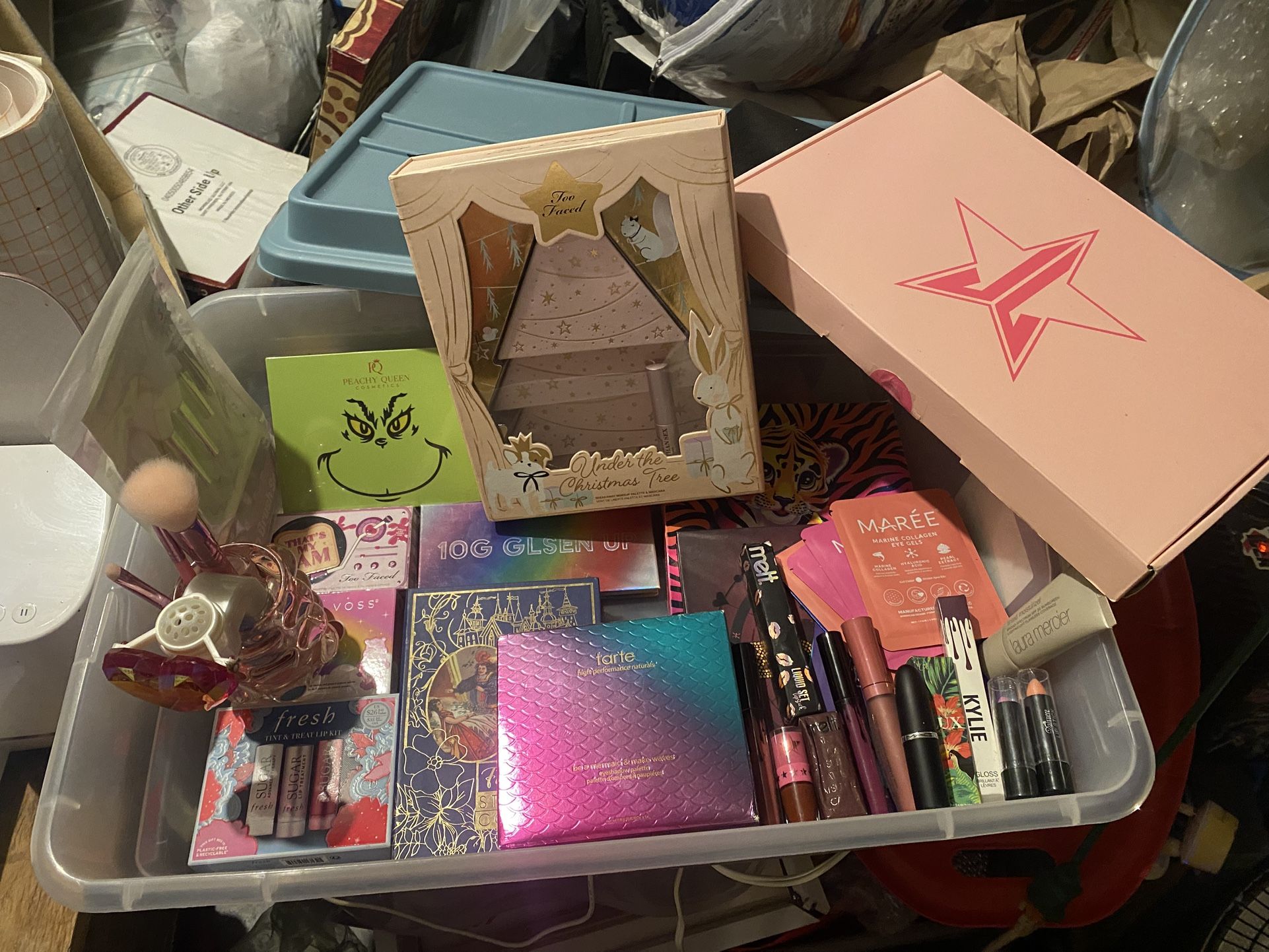 there are themed bundles and just assorted pieces of high-end make up eyeshadow palette, Lippiee skin care, etc.