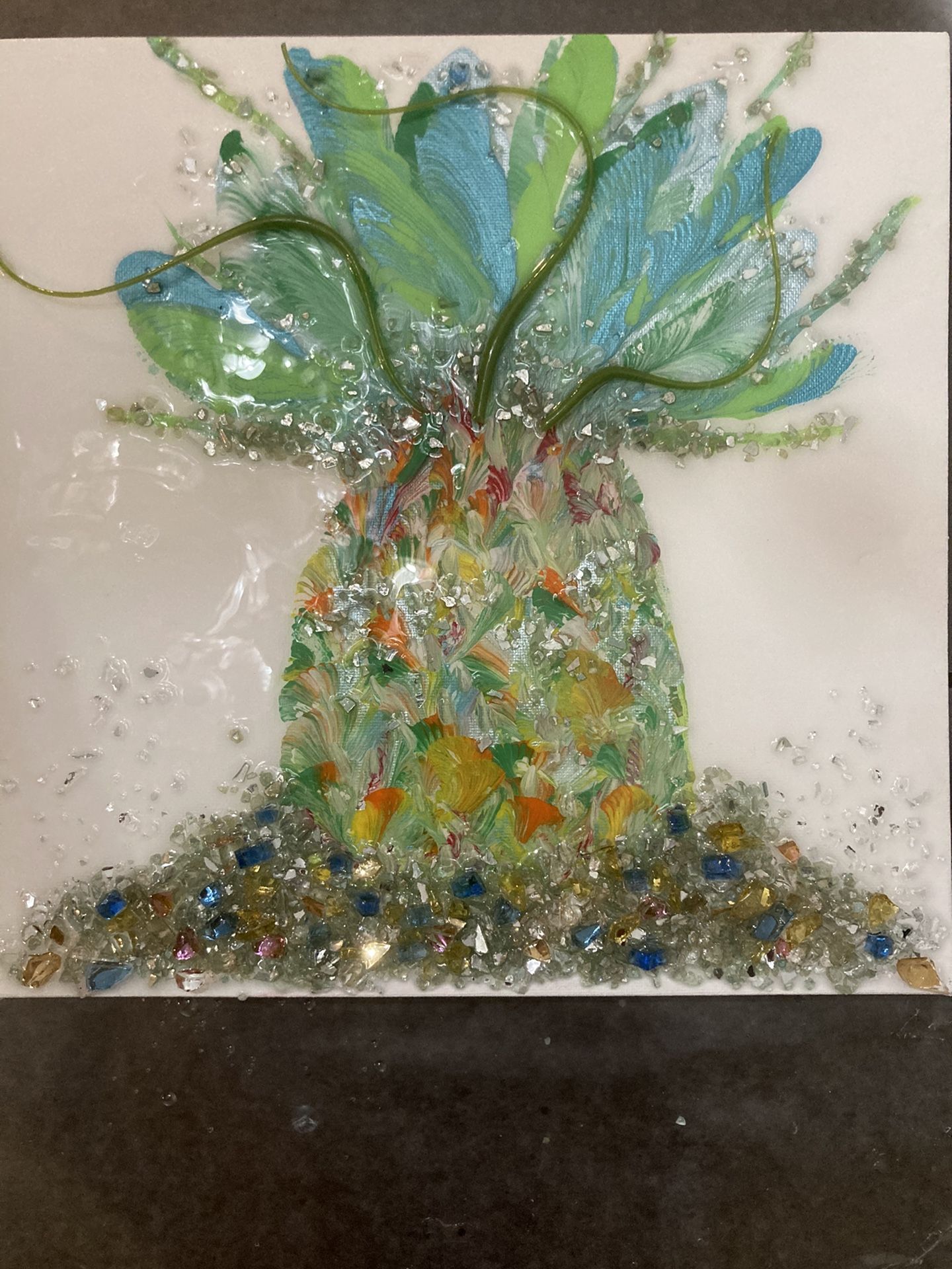 12x12” pineapple painting then added fire glass and vitrigraph glass and covered in resin