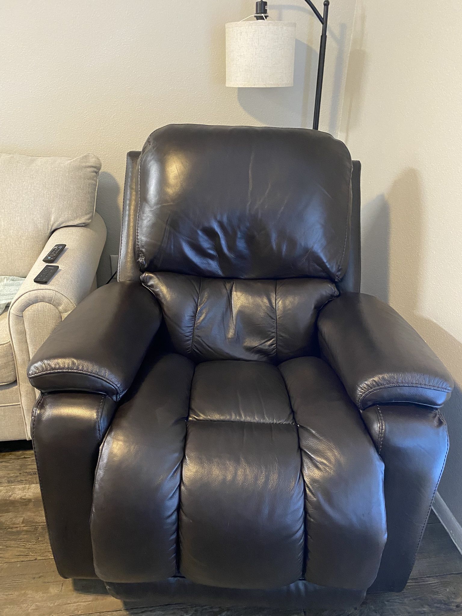 Greyson Rocking Recliner with real leather by La-Z-Boy. Super comfy chair that rocks and reclines. Bought new and it’s in great condition aside from some barely noticeable scratches. Asking $500 or best offer. Overall Width: ~38.5 inches (97.8 cm) Overall Depth: ~41 inches (104.1 cm) Overall Height: ~43 inches (109.2 cm) Seat Width: ~20 inches (50.8 cm) Seat Depth: ~23 inches (58.4 cm) Seat Height: ~20.5 inches (52.1 cm)