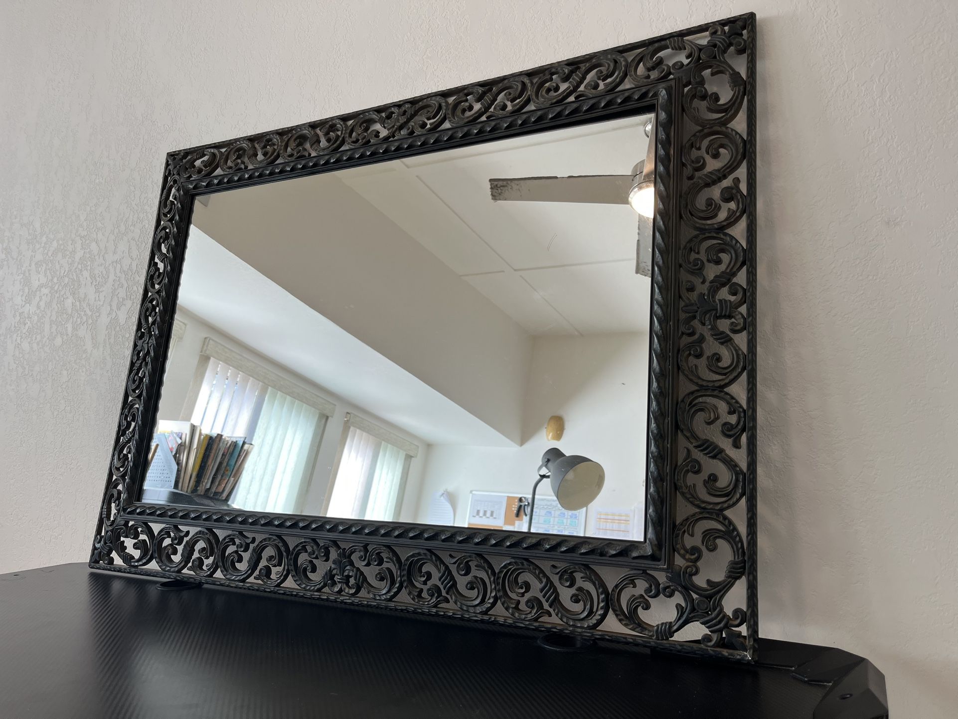 36” long 26.5” wide Wrought Iron look but it’s not metal. Not sure what material it is but it is more like plastic. I have two, one has damage on the corner which can be fixed with glue. The damaged one is $50