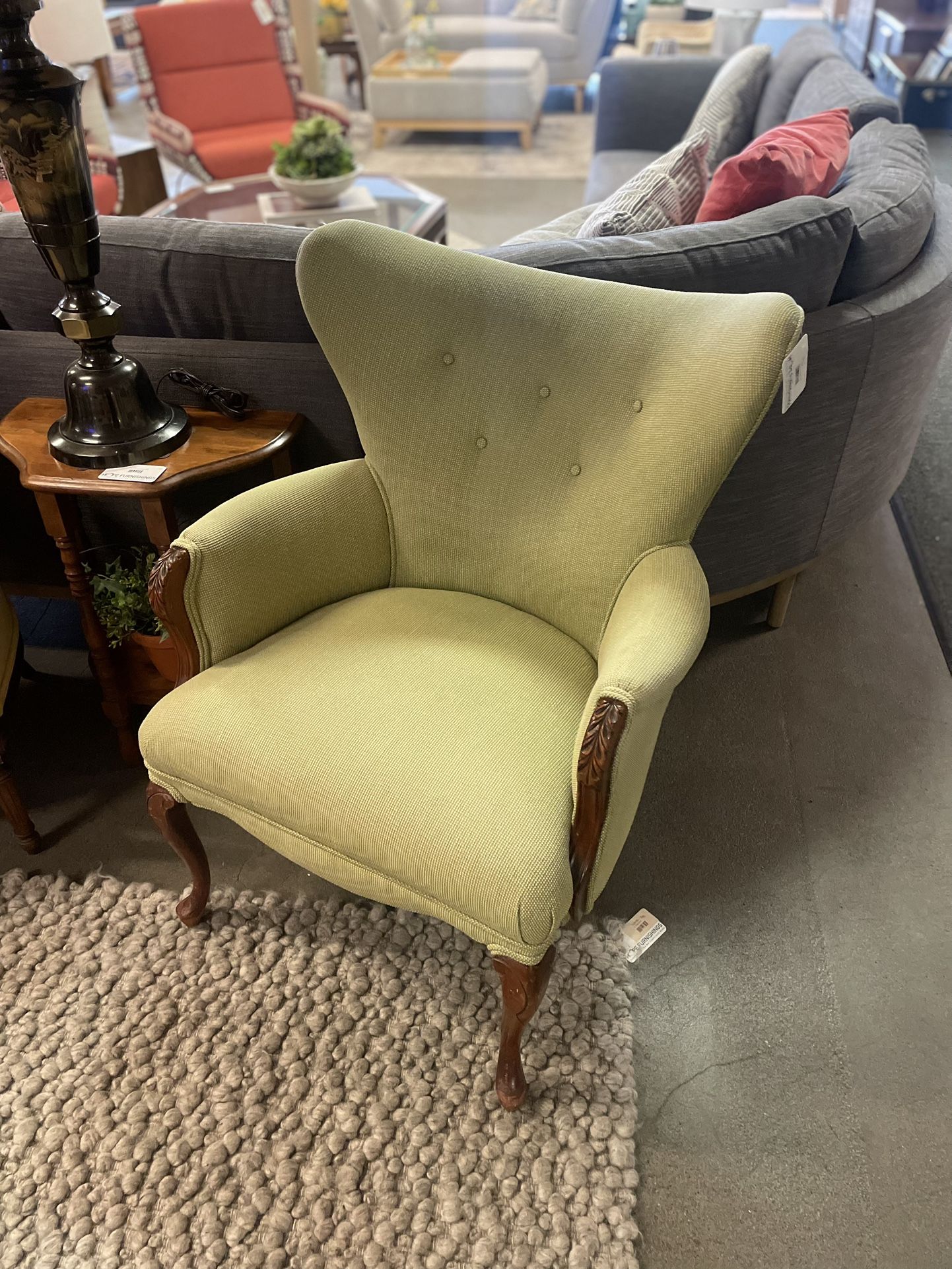 Charming and classic wingback accent chair. The spring green upholstery is in excellent condition. 28 inches wide; 33 inches deep; 18 1/2 inch seat depth 36 1/2 inch height Hope Furnishings is the retail program of NW Furniture Bank. We are a nonprofit organization and all of the proceeds from the store are used to help us provide furniture and other necessary household items to local families and individuals in need. All sales are final, so we recommend that you visit our store to view any items that you wish to purchase in person.