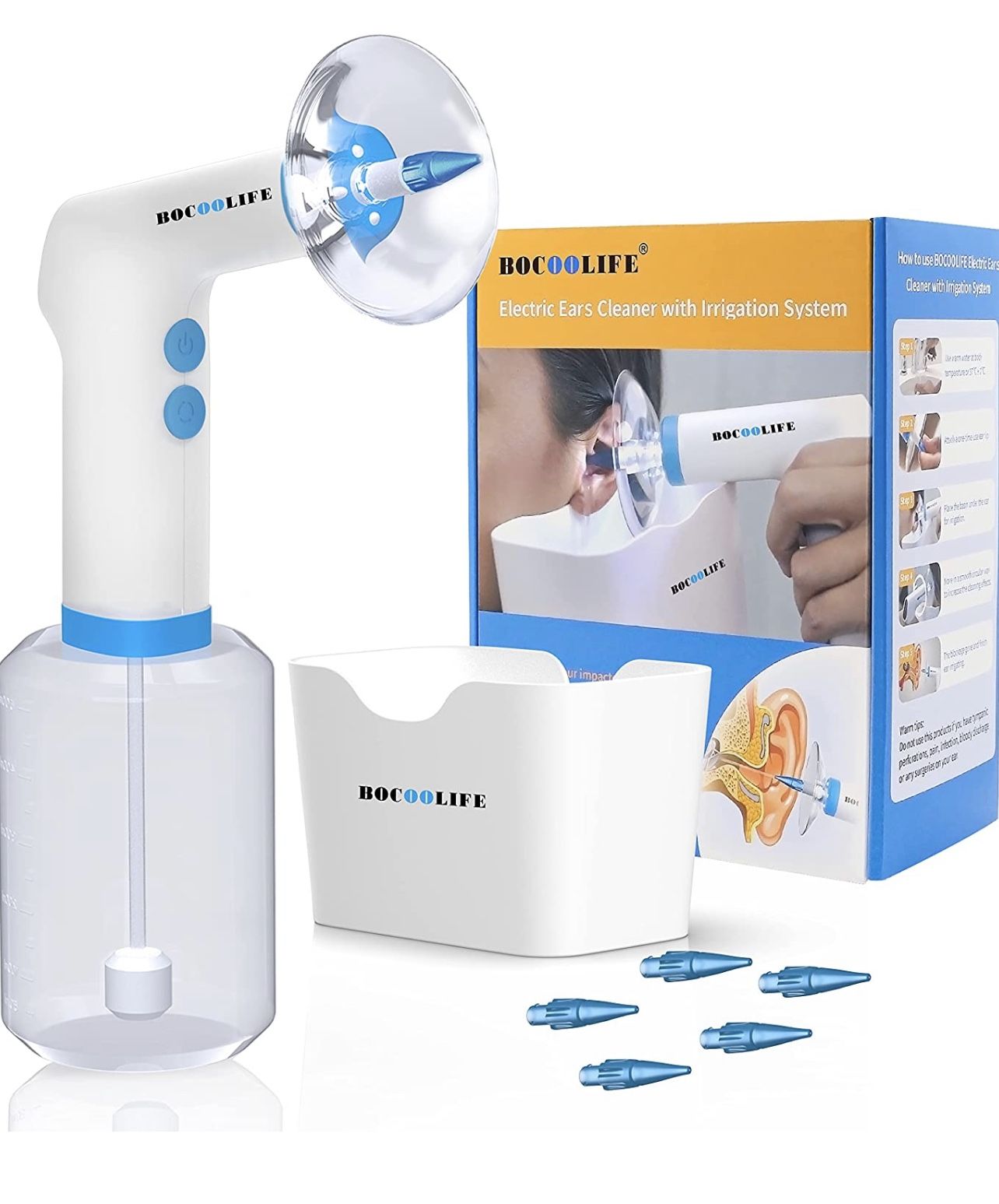 BOCOOLIFE Electric Ear Wax Removal Ear Irrigation Water Cleaner Kit, Ear Cleaning Kit Wax Remover Tool Ear Flushing System, Safe and Easy Ear Wash with 4 Pressure Levels, 5 Disposable Tips, Ear Basin No more q-tips 4 led lights Magnifying lenses for easy cleaning Painless and effective