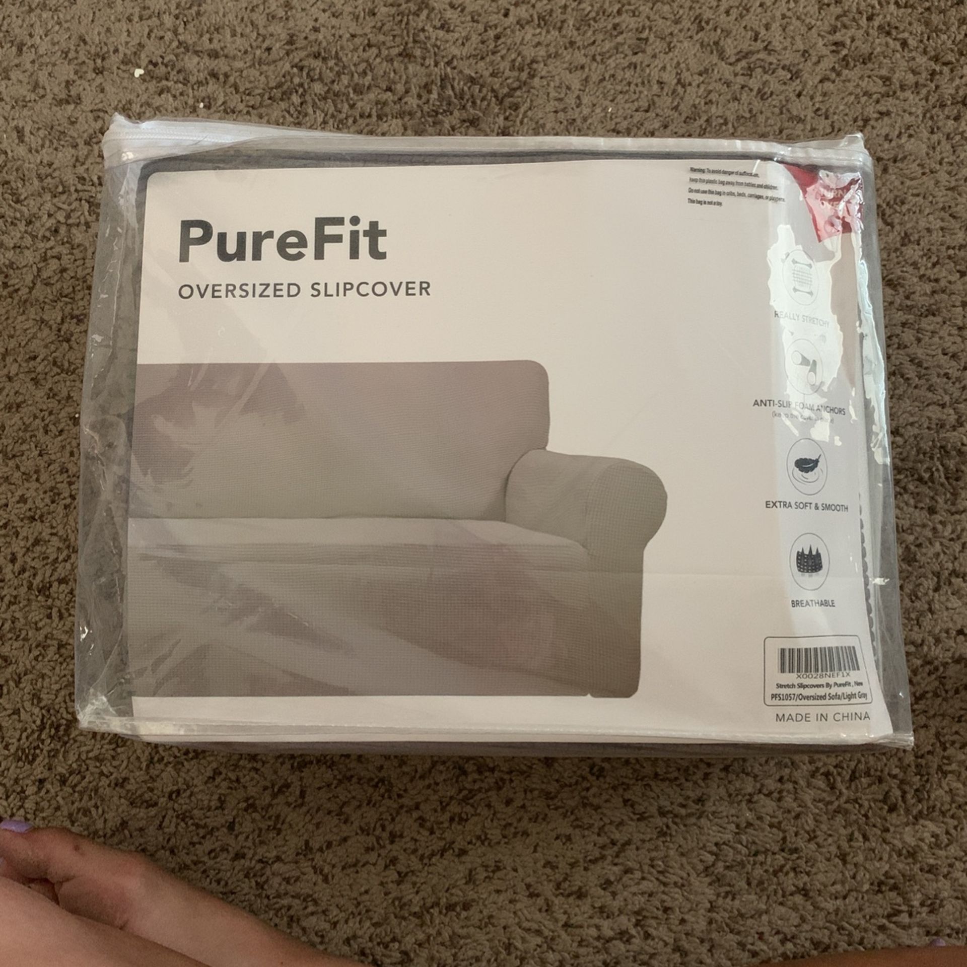 Originally bought on Amazon New, never opened Grey textured slip cover with anti-slip foam anchors Material stretches to 78" with seat width up to 81"
