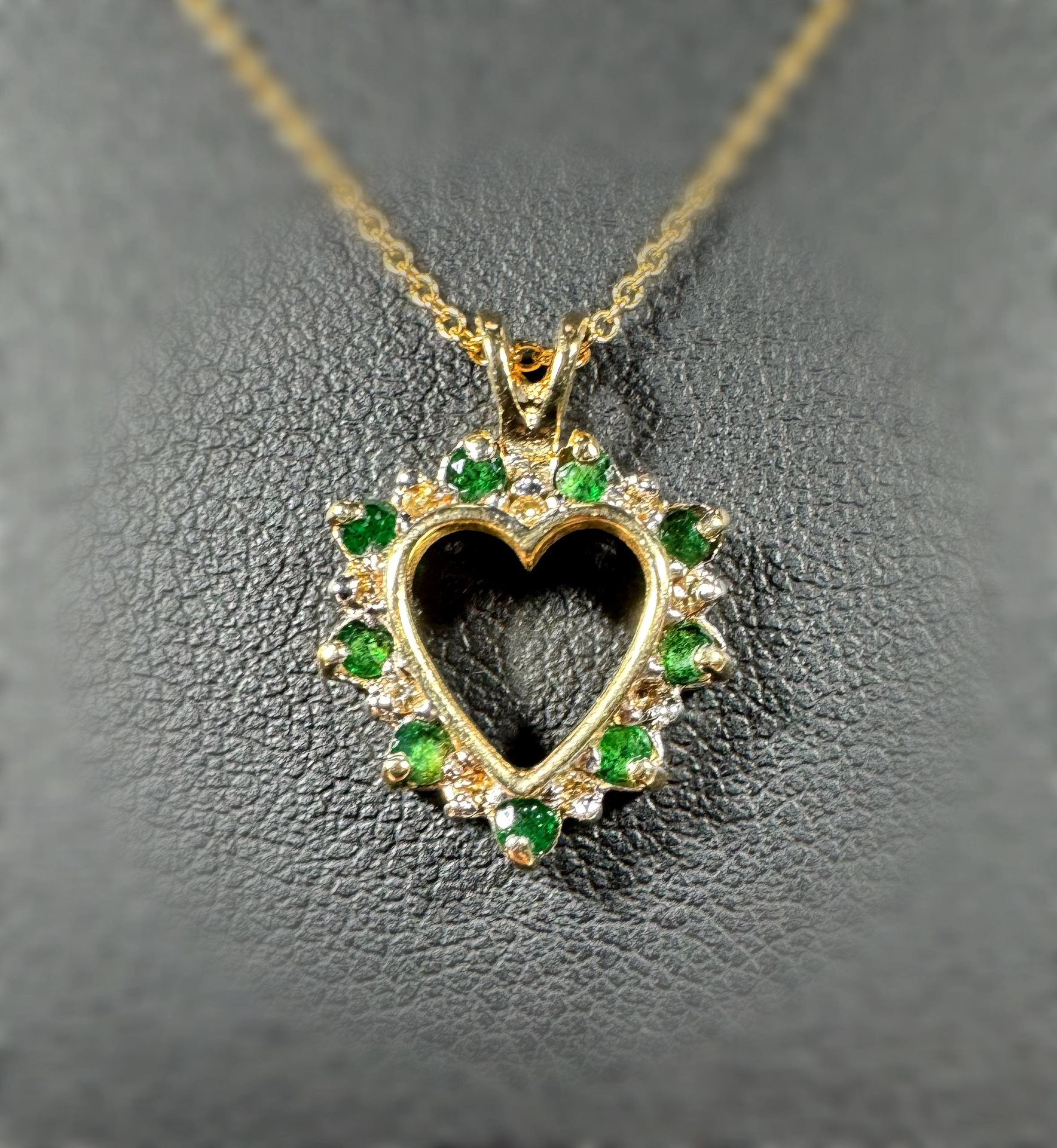 This gorgeous heart pendant is made of 14k hollow yellow gold with natural diamonds and emerald stones. Total weight: 1.50 grams. It is very beautiful piece. The total carat weight of the natural diamonds is approximately 0.10CTW.π The total carat weight of the emerald stones is approximately 0.70CTWπ CHAIN SELLS SEPARATELY You can wear with chain or bracelet, looks very gorgeous π₯ Perfect gift! β€οΈππ We buy Rolex and Audemars, patek . Do layaway in VIP PAWN Coral Springs π₯ππΈ