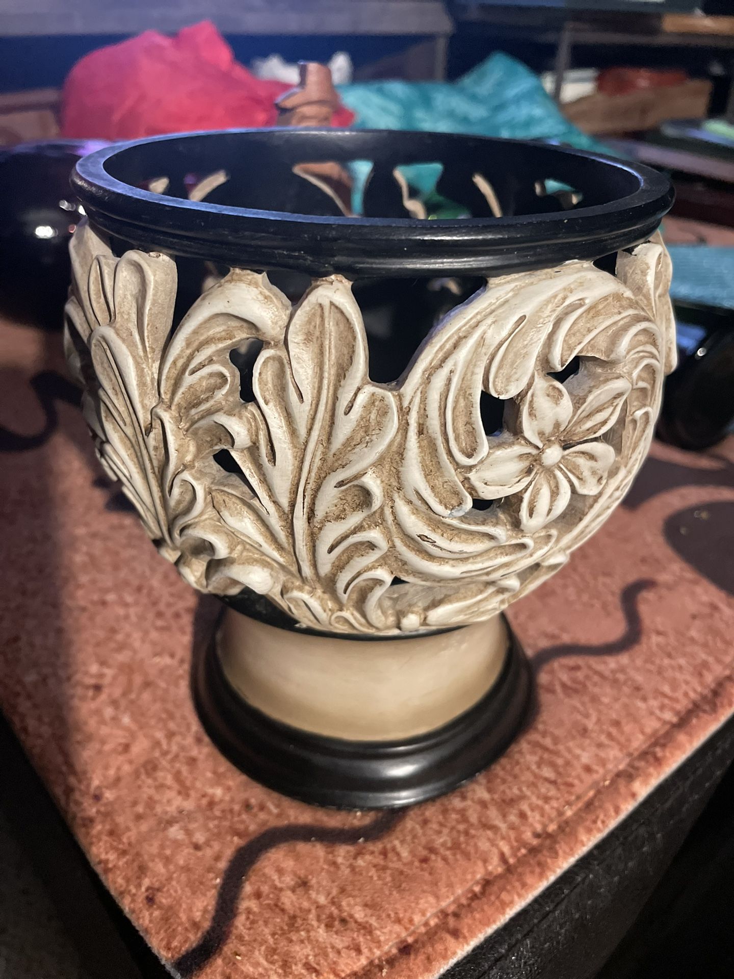 Beautiful black and beige decorative small bowl 🪴plant holder or candle 🕯️ holder, featuring ornate, carved, or molded acanthus leaf and floral designs with a contrasting black and beige finish. It is designed to be a centerpiece or a stand for other items like pillar candles or floating flowers. The style often incorporates both a pedestal base and a decorative bowl element Base / bottom 3 inches would be great for a candle holder 🕯️ top opening is 5 inches 7 inches tall Will meet In shoreline or Camano