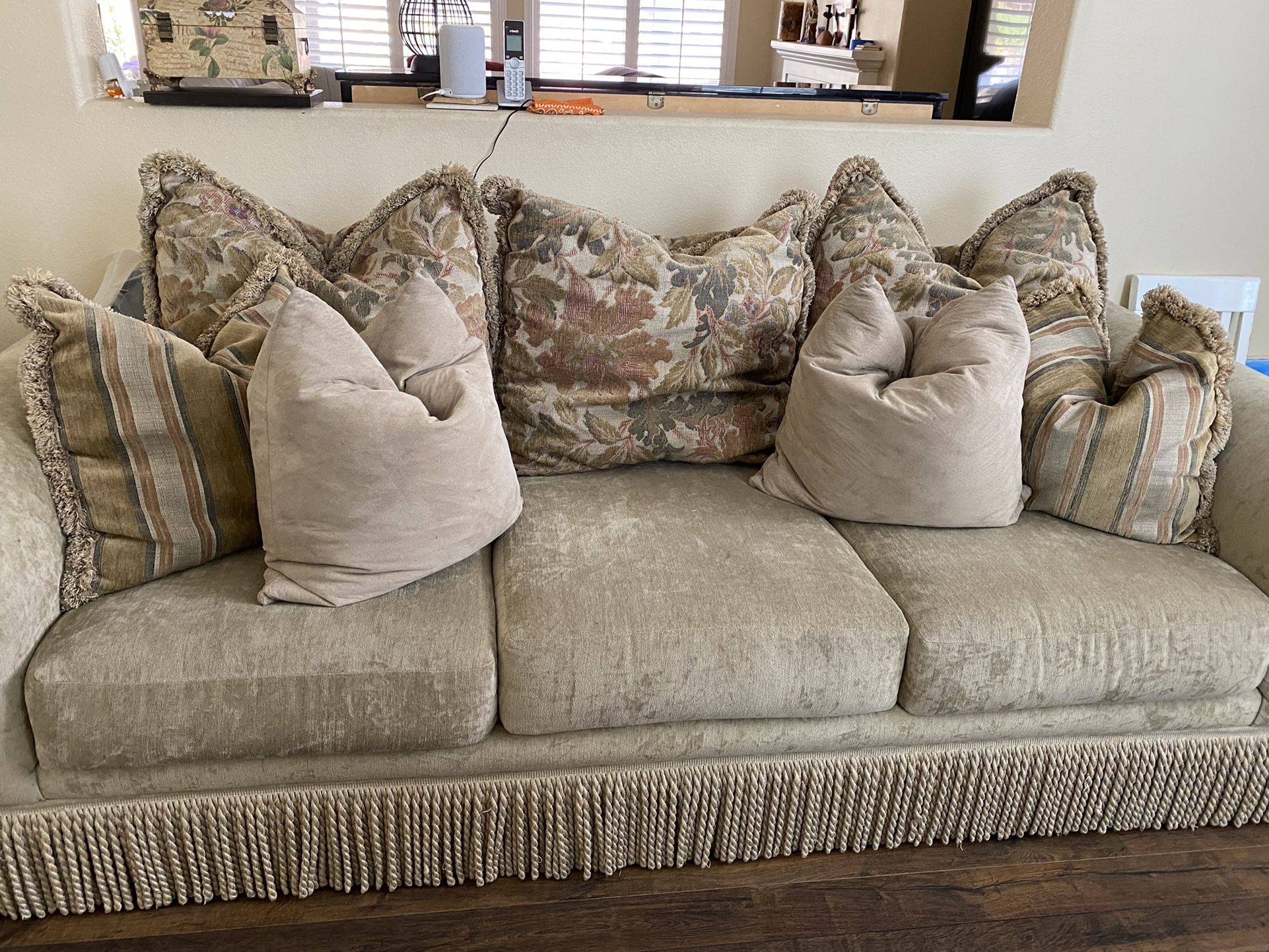 Chenille sofa with fringes and oversized pillows