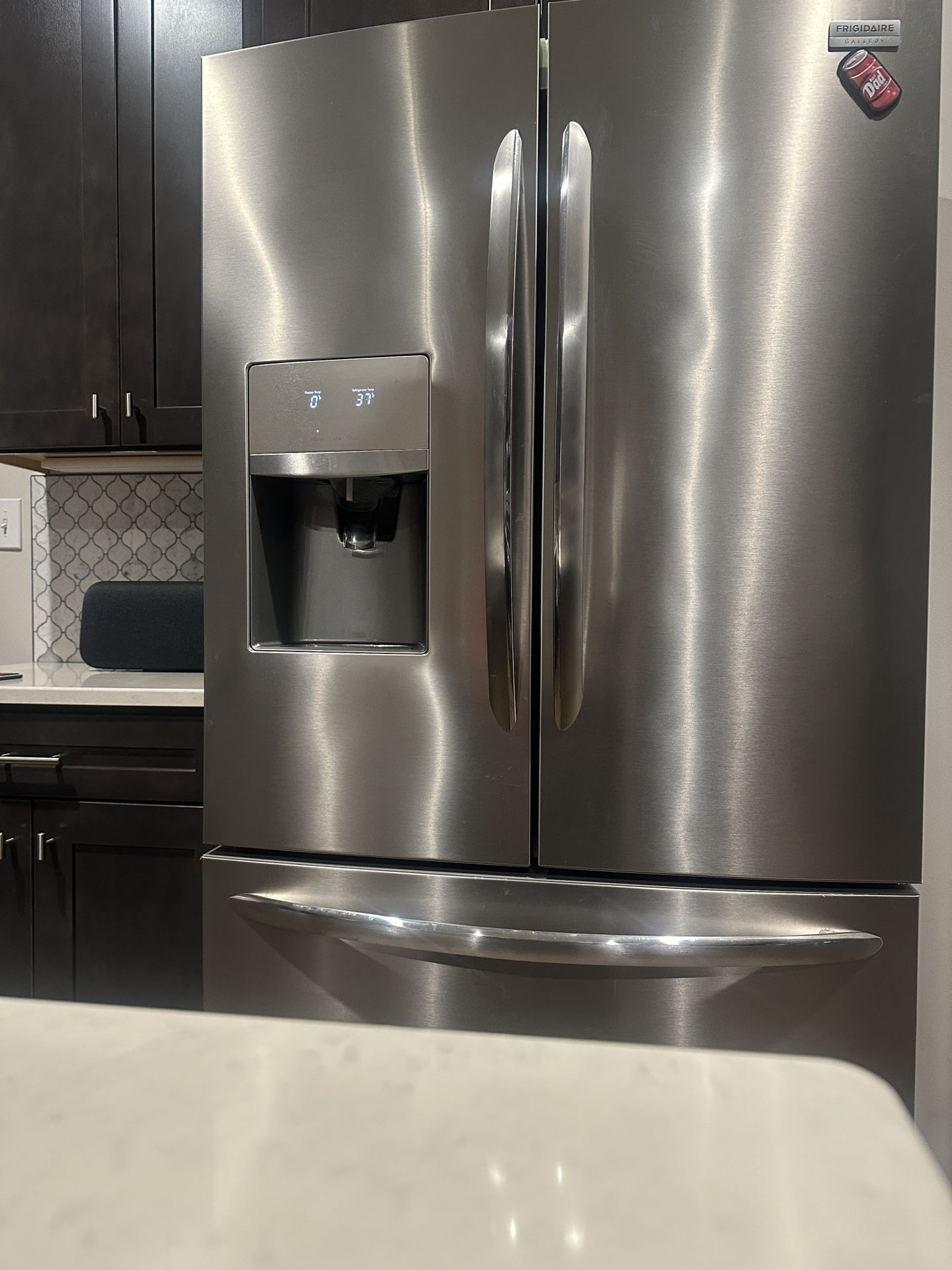 Stainless Frigidaire normal use works great. Front and lower ice makers all work small ding on door.