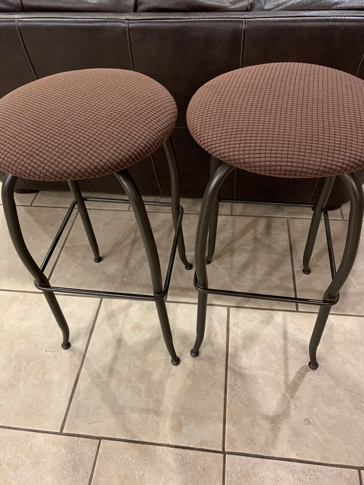 2 barstools measuring 29 inches tall Like new! Very strong and sturdy! First photo has covers on them. Second photo shows the original pattern of cushion.