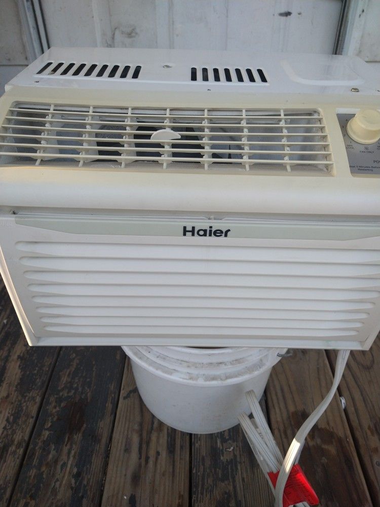 Haier air conditioner 5200 BTU. Works fine NO ISSUES blows cold air. It doesn't have the sides. But again works great.