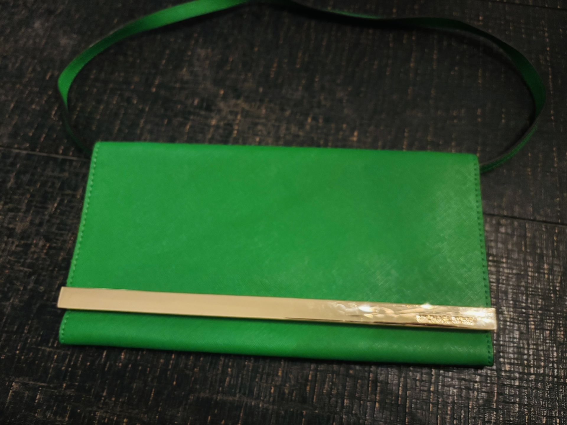 Dimensions (inches) : Length - 11 ; Height - 6 ; Strap - 22 Michael Kors Kelly Green Shoulder / Clutch/ Evening Bag Tiles Palm Clutch/removable strap good condition inside pocket and credit cards slots