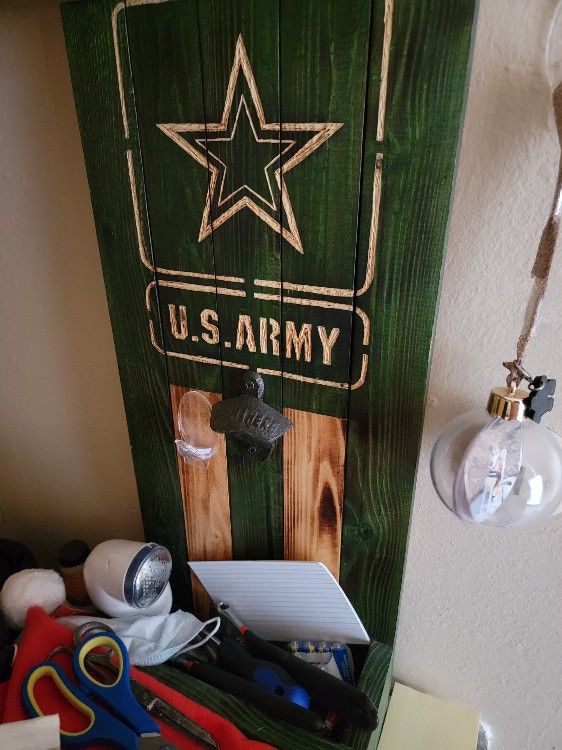US Army bottle opener. Custom made. I don't need it anymore Great gift for a man cave. Has a catcher at the bottom for the bottle caps Shoot me an offer