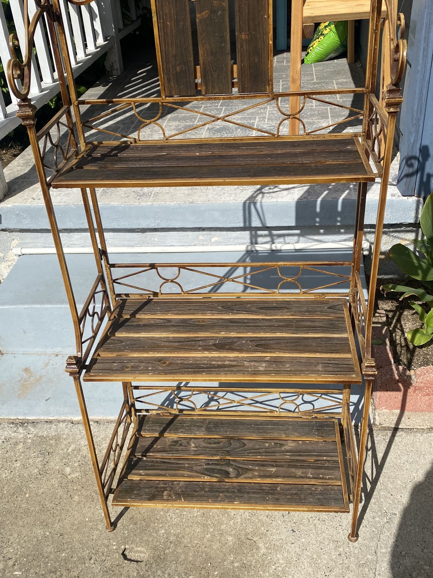 Three shelf buffet wood &iron light weight but very sturdy all shelves can swivel up and down,can be used for plants or in a pantry kitchen or bathroom please text only when ready to pick up no delivery’s price is firm