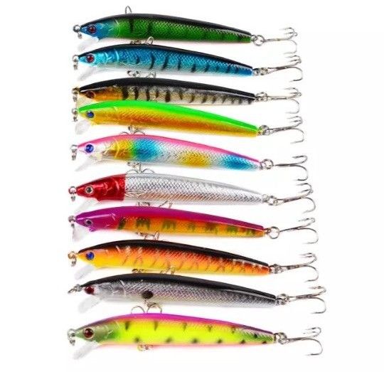 Fishing lures wobbler 10 pack lot. Aproxx 4"long. Metal vibration balls inside the body to attract big predators and balance performance of the lure. Brand new 10 pack lot.