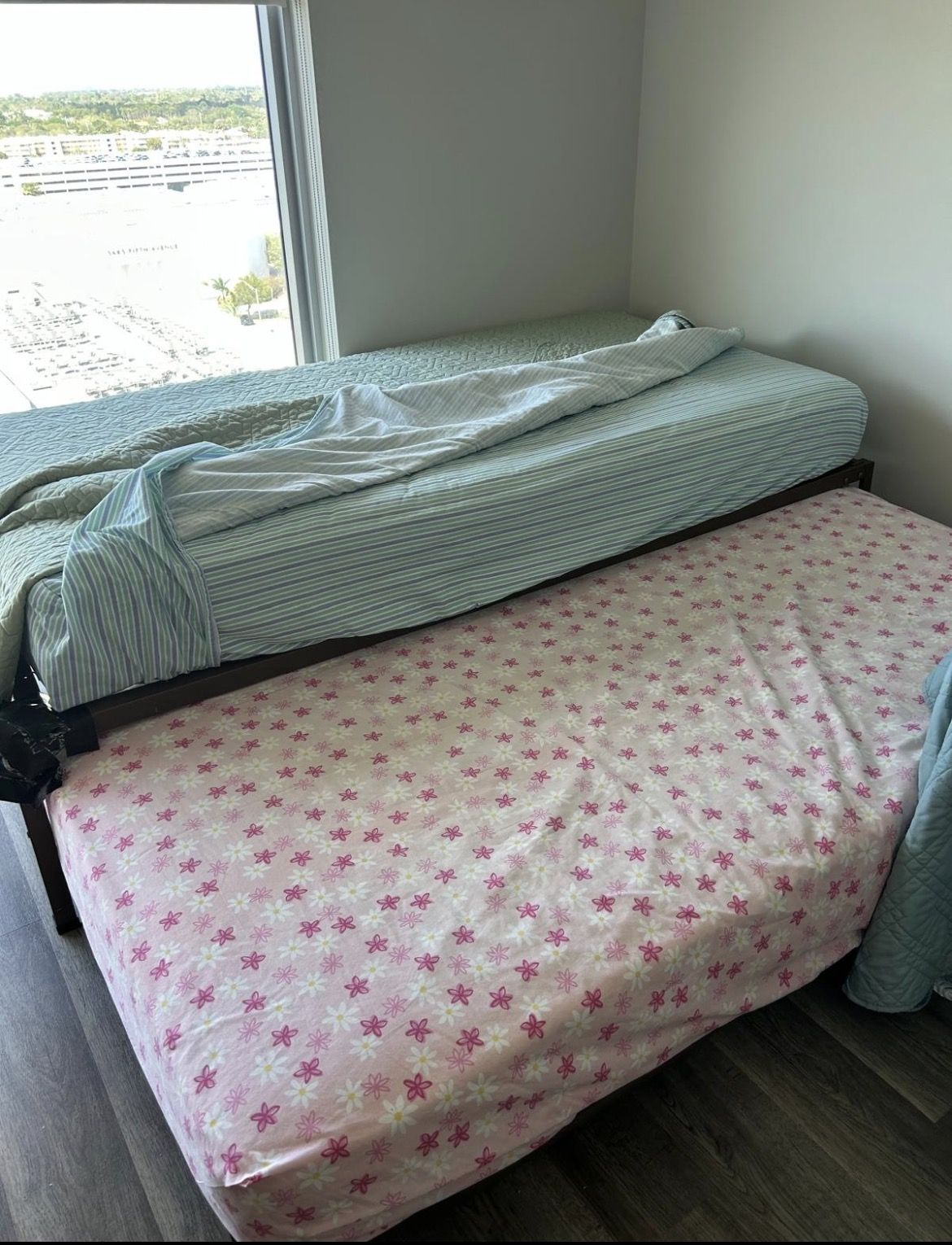 Brown metal frames. The lower bed rolls out from under the upper bed and can easily be raised to the same level as the upper bed. Both mattresses are in good shape.