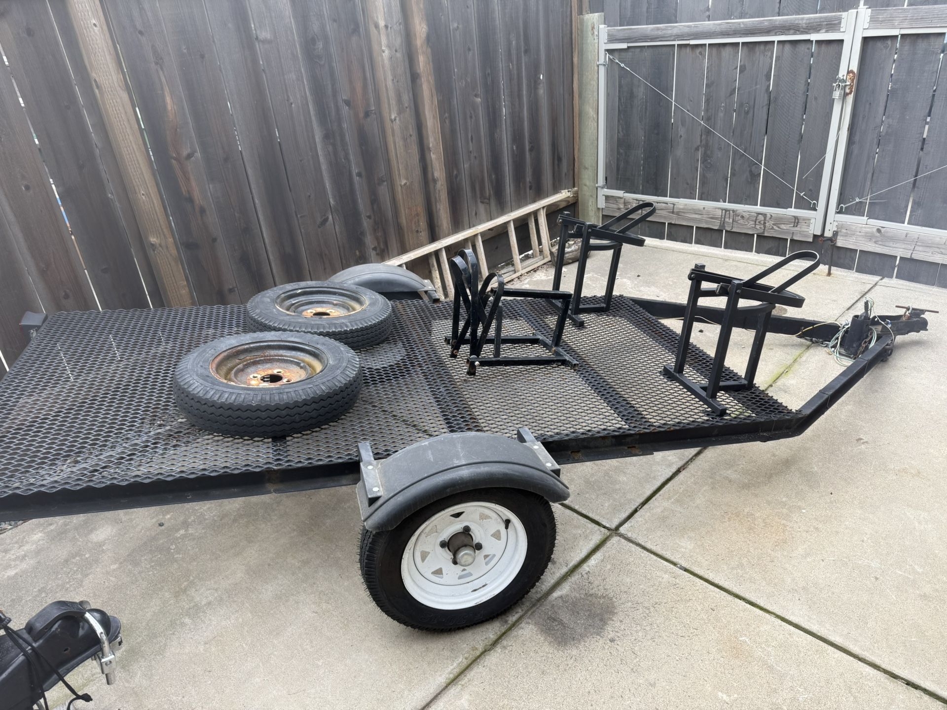Trailer has new wheel bearings, new rims and tires( there’s the old pair of tires) also has 3 wheel chocks asking 250.00 also look at My page cherry picker 80.00 3 niner jackets 2 are leather 60.00 each 1 is 1970s old 125.00 Real sharks mouth 25.00 Old pane window 25.00 Chess or checker board 45 years old made from maple and black walnut solid wood very nice board 30.00