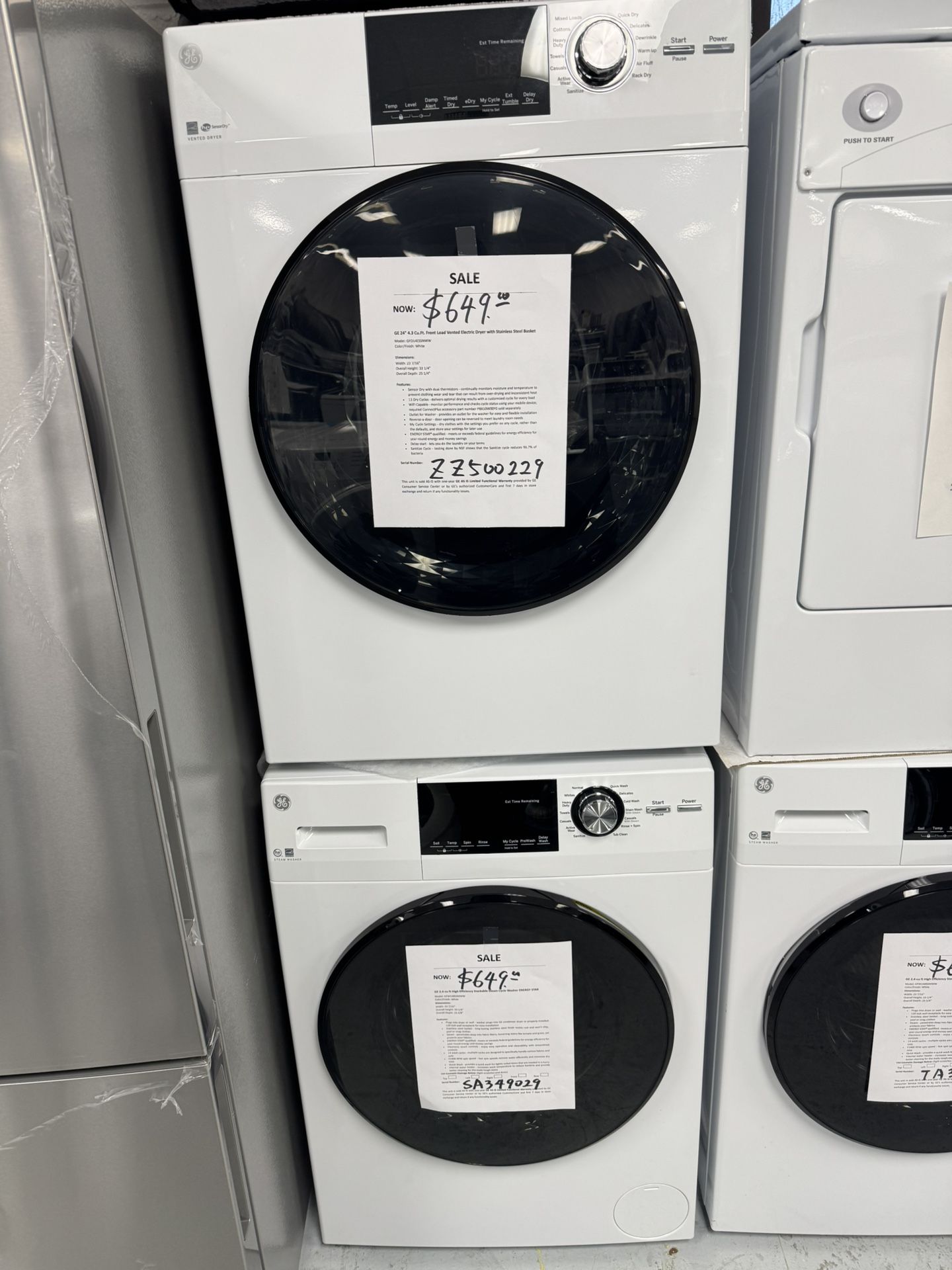 Condition: open box never used with one year manufacturer warranty Washer: 2.4 cu.ft, model: GFW148SSMWW $649 Dryer: 1) 4.3 cu.ft. Vented 240V model: GFD14ESSNWW $649 2) 4.1 cu.ft ventless 240v model: GFT14ESSMWW $699 3) 3.6 cu.ft 120V vented model: DSKP333ECWW feel free to stop by and check them out 4520 Lacey Blvd SE Ste 39, Lacey WA 98503 (behind Walgreens ) Business hours: Mon-Sat: 10am - 6:30pm;
