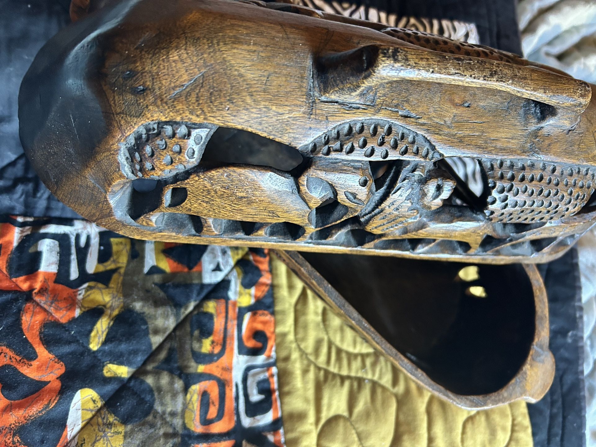 A vintage carved wooden basket with a lid. The decorative carvings depict African animals such as a lion, elephant, buffalo and rhino. It is in nice condition and has a lovely warm wood grain finish to it. The age is unknown but possibly from the late 20th century ca. Dimensions�Height 24cm�Width 37cm�Depth 15cm 70 The selected region of the quilt features fabric incorporating Adinkra symbols. Originating from the Bono and Asante people of Ghana and Côte d'Ivoire, these traditional stamped symbols represent proverbs, historical events, and cultural concepts. The quilt square in the lower right, with the gold fabric and intricate stitching, depicts the "Gye Nyame" symbol. This specific symbol is widely recognized and translates literally to "except for God," signifying the omnipotence and existence of God. The surrounding squares also use African-inspired prints and a traditional quilting style often associated with African American art quilts