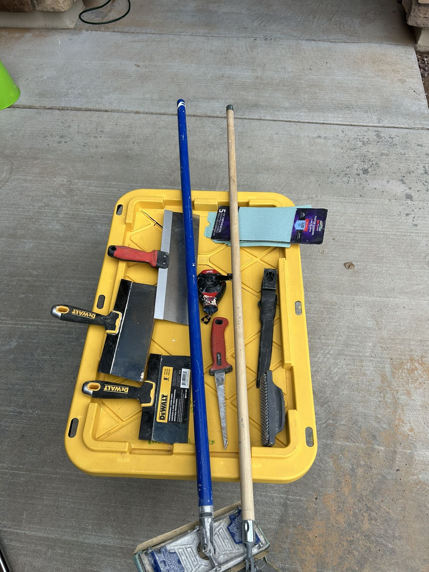 Drywall knives, 2 drywall pole sanders, stack of sanding paper for the sanders, chalk line
