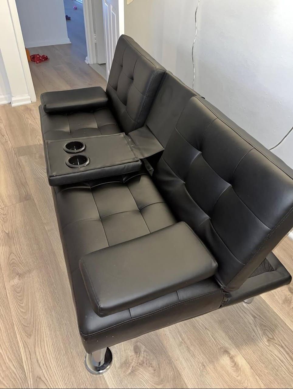Selling this stylish black faux leather sofa/futon. It has a classic tufted design that fits perfectly in a living room, office, or apartment and converts into a bed! Perfect for someone looking for a modern look on a budget.