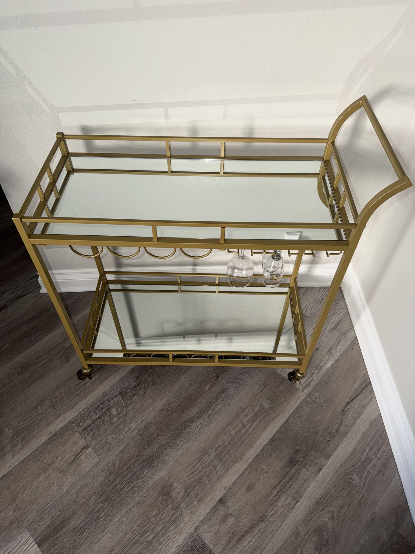 Elegant gold bar cart with glass shelves and built-in wine holder. Perfect for entertaining or styling your space. In great condition — rolls smoothly.