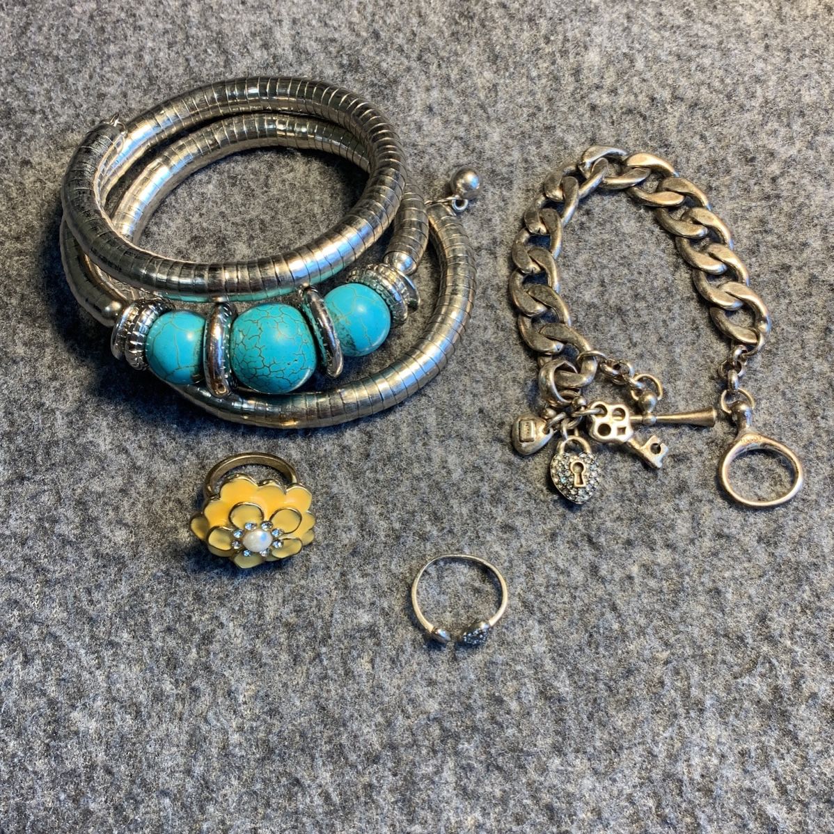 Including one adjustable bracelet, one Fossil bracelet, one adjustable ring and one floral ring in size 6. $15 for all. Must go together.