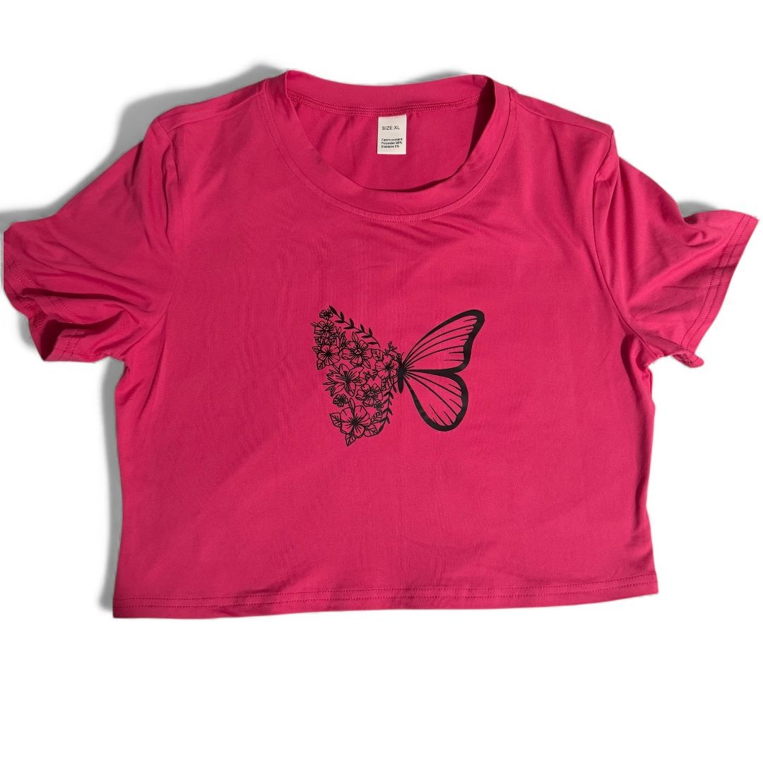 Women’s Short Sleeve Pink XL Pink and Black Graphic Crop Top