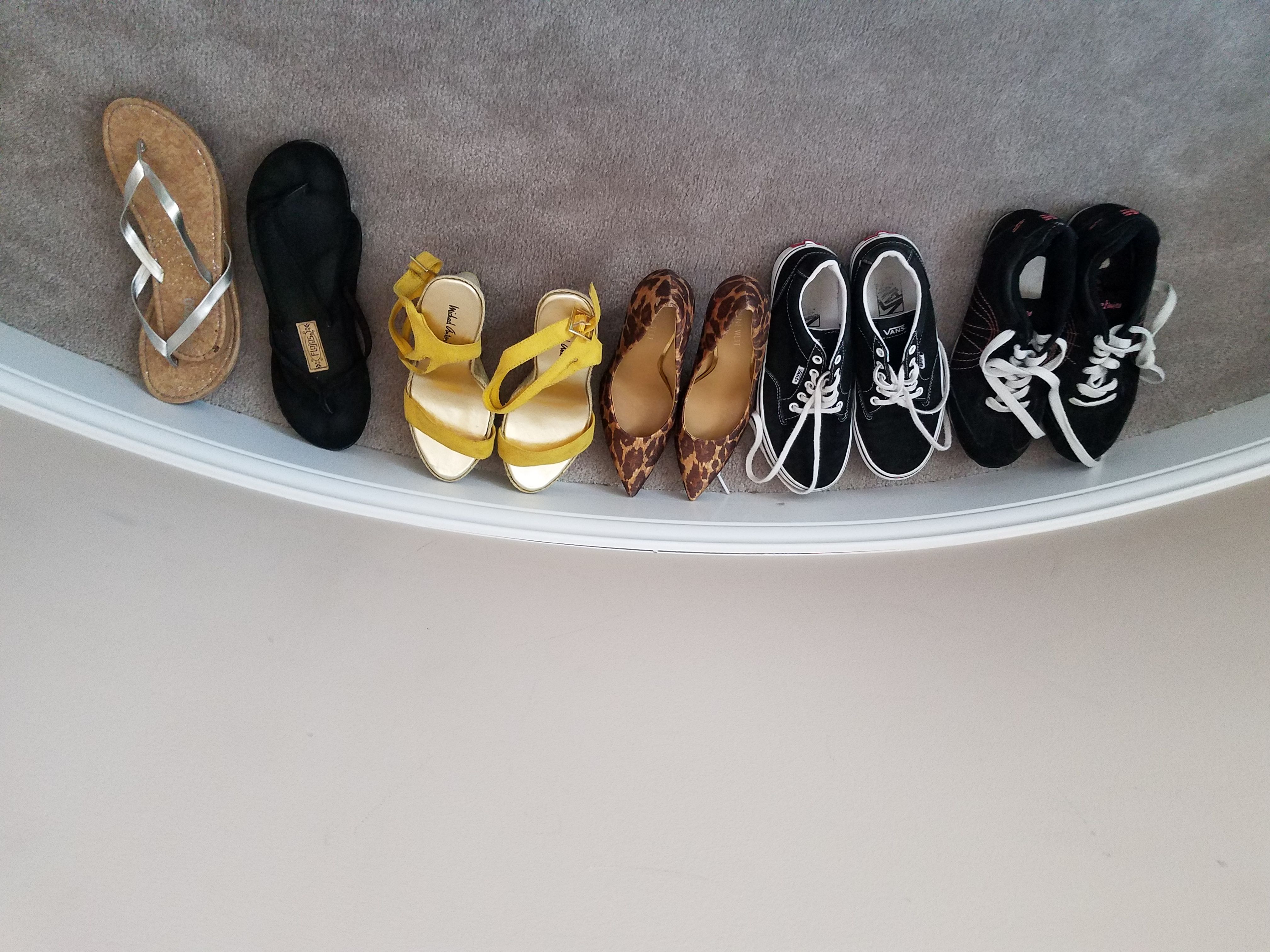 . Black Skechers with pink stitching size 7 - $5. Black and silver flip-flops size 6 - $3. Yellow sandals and animal print pumps $5 each size 6 1/2 .
