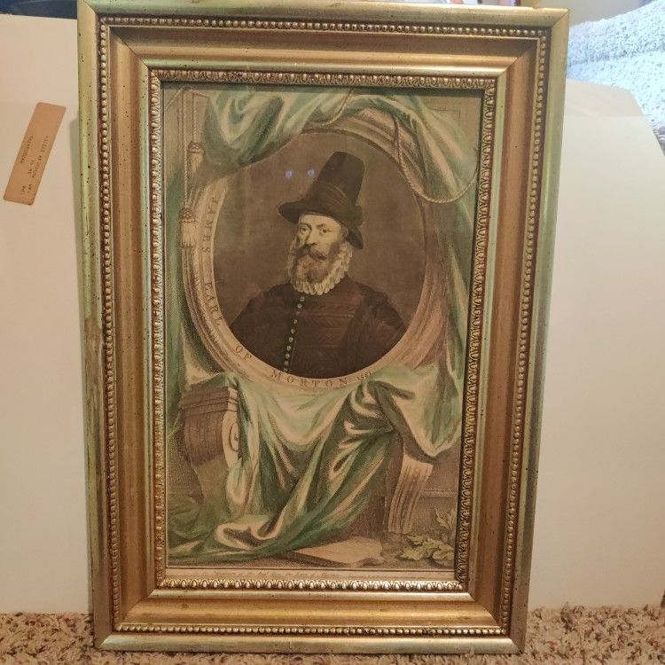 Antique engraving that is nicely framed. Inscription: across bottom plate: In the Possession of the Rig:t Hon: the Earl of Morton. Impensis. I. & P. Knapton Londini. 1741. J. Houbraken sculps. Amst. 1740.; around portrait plate: JAMES EARL OF MORTON 1581. He was a Scottish politician involved in the power struggle around Mary Queen of Scots and her husbands. See original placard on back as well. Measurements on photos. Museum quality antique that is a legacy antique and investment. Porch pickup from smoke-free home. (MOMS).