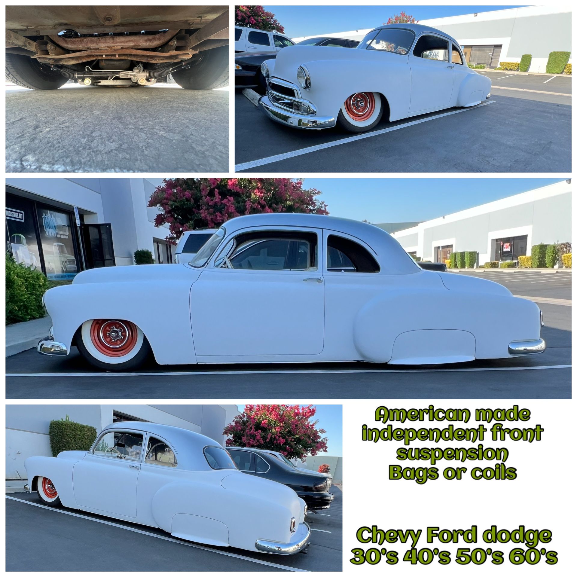 Independent front suspension hub to hub air bagged or coil overs any bolt pattern we build the kits in house and are vehicle specific 30-50s cars and trucks f 100s- up to 79 complete hub to hub kits run 2495 . Plus installation