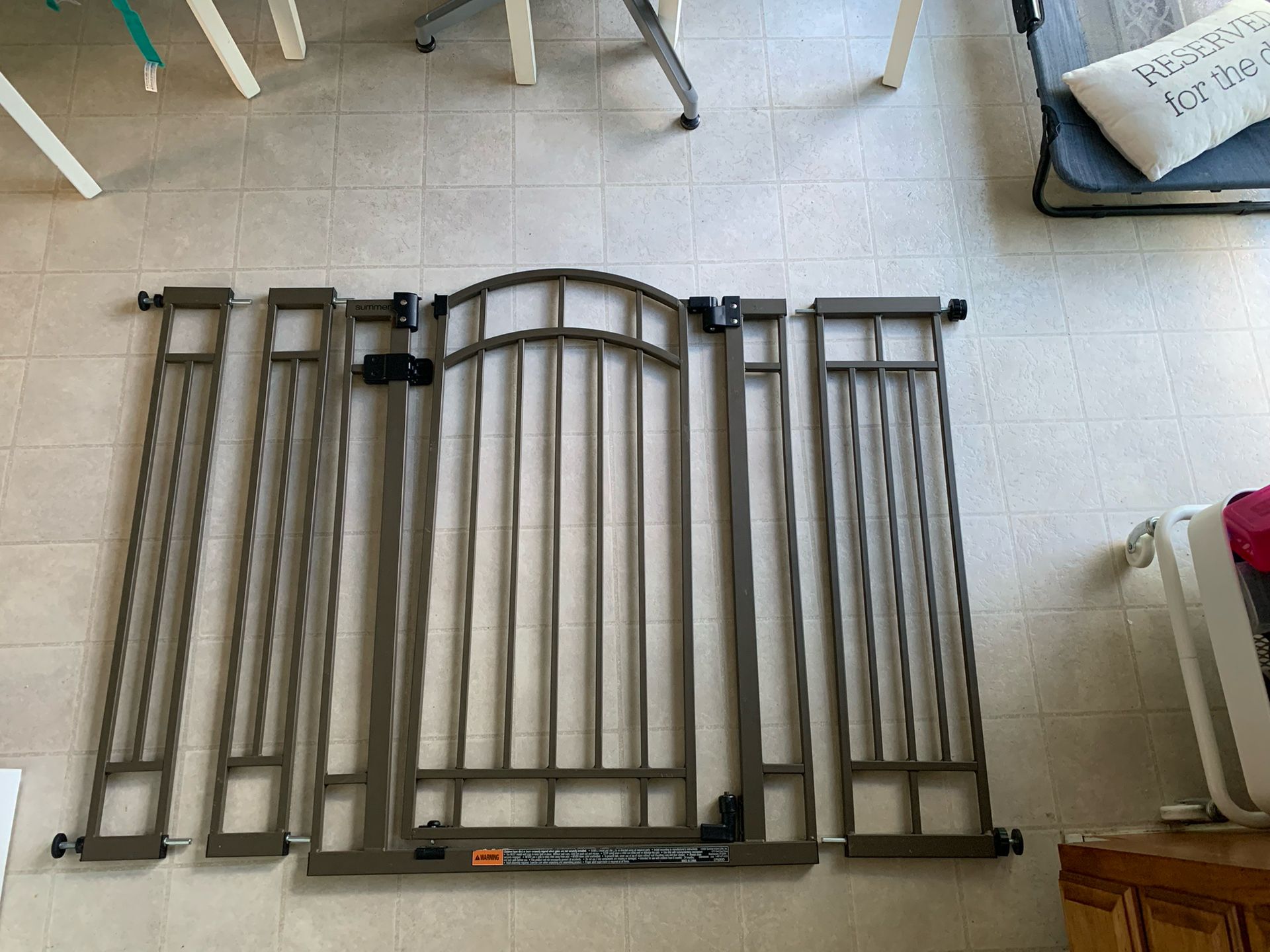 Large heavy duty metal baby gate. Multiple pieces so you can fit it in more than one size space. 2 pieces are 4” wide 1 piece is 8” wide 1 piece is 28” wide 3’ tall at tallest point (at arch) Good condition. Sells new for 64.99