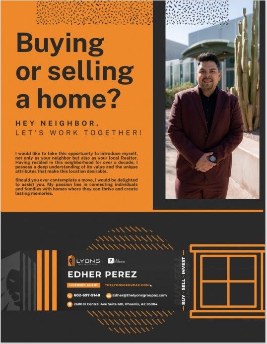 Buying or selling a home? HEY NEIGHBOR, LET'S WORK TOGETHER! I would like to take this opportunity to introduce myself, not only as your neighbor but also as your local Realtor. Having resided in this neighborhood for over a decade, I possess deep understanding of its value and the unique attributes that make this location desirable. Should you ever contemplate a move, I would be delighted to assist you. My passion lies in connect individuals and families with homes where they can and create lasting memories. LYONs -REAL STATE GROUP EDHER PEREZ LICENSED AGENT https://offerup.com/redirect/?o=VEhFTFlPTlNHUk9VUEFaLkNPTQ== (contact info removed) (contact info removed) 2600 N Central Ave Suite 610, Phoenix, AZ 85004 BUY - SELL - INVEST