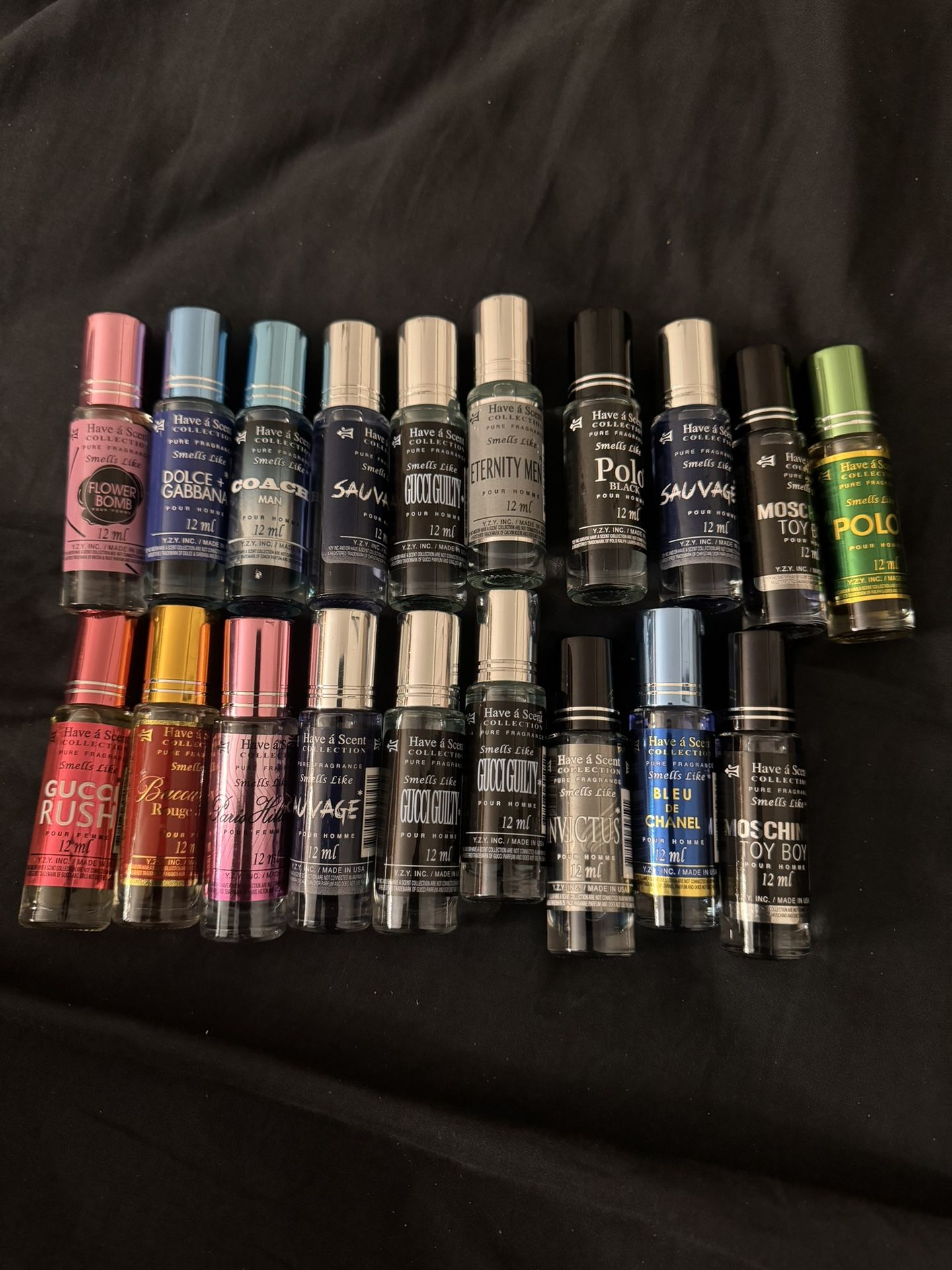 Perfume and Cologne Oils $5 each OR 5 for $20 Shipping Available ⬇️ ⬇️ ⬇️ Available Scents ⬇️ ⬇️ ⬇️ ***Men’s Cologne*** 212 by Carolina Herrera Acqua Di Gio Angel Animale Armani Azzaro Bad Boy Carolina Herrera Black Code Bleu de Chanel Bond #9 Bvlgari Man Carolina Herrera Men Ck1 by Calvin Klein Coach Man Cool Water Creed Aventus Curve Dolce Gabbana Dolce Gabbana K Drakkar Eternity Men Givenchy Gucci Guilty Hugo Boss Initio Invictus Issey Miyake Jacomo Jaguar Jean Paul Gaultier Jimmy Choo Man Joop Kouros Yves Saint Laurent Lacoste Blanc Lapidus Layton L’Homme by Yves Saint Laurent Mont Blanc Moschino Toy Boy One Million One Million Lucky Polo Polo Black Polo Red Polo Sport Prada Luna Rossa Sauvage Dior Tommy Hilfiger Versace Blue Jeans Versace Eros Xerba Pura Y Men by Yves Saint Laurent ***Women’s Perfume*** Amazing Grace Anais-Anais Angel Ariana Grande Armarige Givenchy Baccarat Rouge 540 Bain De Champagne Black Opium Yves Saint Laurent Bond No. 9 Burberry Her Cabotine Chanel No. 5 Chloé Coach Floral Coco Mademoiselle Chanel Delina J’adore by Dior Dolce & Gabbana Light Blue Double Diamond Dylan Blue by Versace Far Away by Avon Flower Bomb Good Girl by Carolina Herrera Gucci Bloom Gucci Guily Gucci Rush I Want Choo by Jimmy Choo J’Adore Jennifer Lopez Kim Kardashian La Vie Est Belle Lancome Lady Million Love Story by Chloe Miss Dior Olympēa Organza by Givenchy Paris Hilton Pink Sugar Poison by Christian Dior Prada Candy Si by Armani Tom Ford Black Orchid Valentino Donna (Born in Roma) Versace Bright Crystal Viva La Juicy White Diamond By Elizabeth Taylor Yara Yellow Diamond by Versace Ysatis De Givenchy
