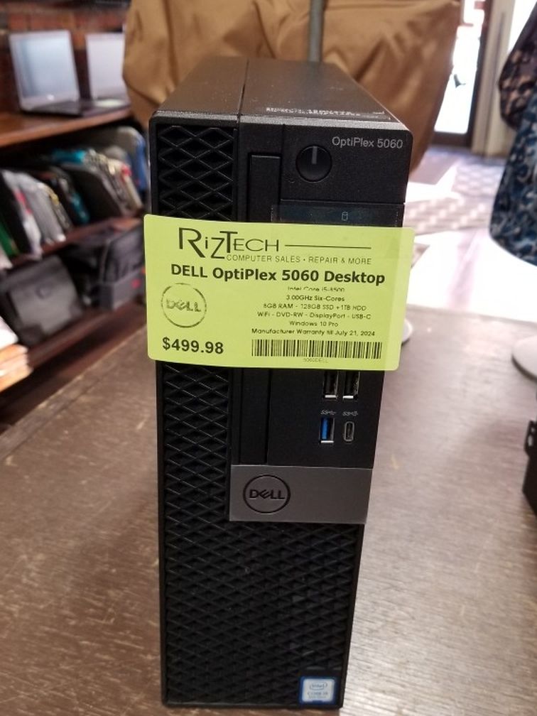 Nearly new with 3 years of Manufacturers Warranty; thru July 21, 2024 Dell OptiPlex Desktop Computer Intel Core i5-8500 3.00GHz Six Cores 8GB RAM 128GB SSD 1TB HDD WiFi DVD-RW Display Port USB-C Windows 10 Pro Includes Power Cord Recertified with Manufacturers Warranty thru July 21, 2024 $499.98 Available at RizTech in Medina Square located at 215 S. Court St. Medina Ohio