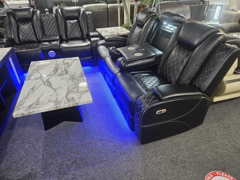 Brand New Black Air Leather Power Reclining Sofa With LED Strip And Reading Lights, Cup Holders, Wireless Charging, And USB Ports + Loveseat