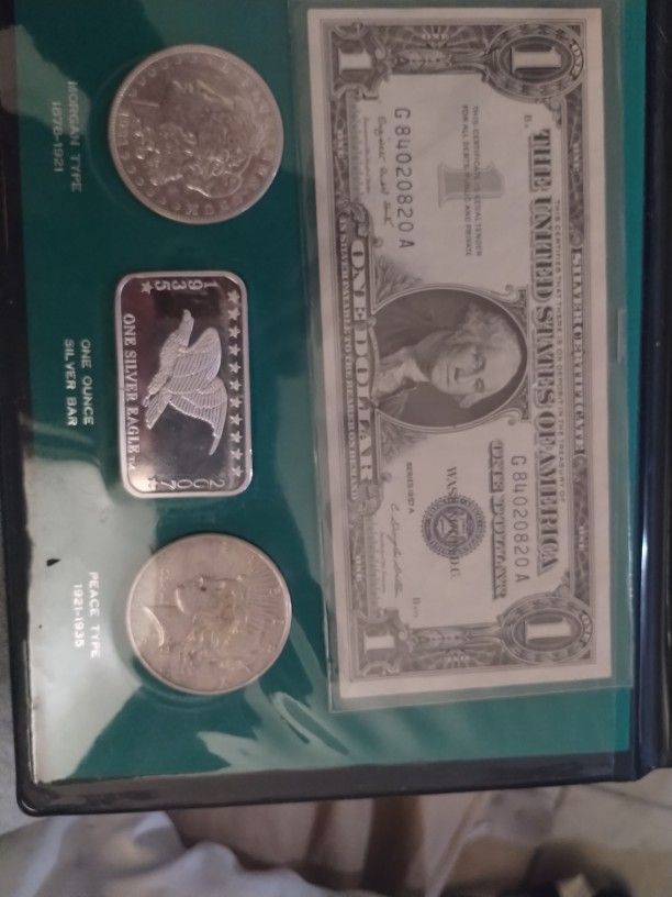 2957 silver certificate 1922 Morgan silver dollar 2935 +2007 silver bar one ounce and a 1921 silver peace dollar . Make me a o ffer of course no low ballers but will accept a fair offer . Names Tim thank you .