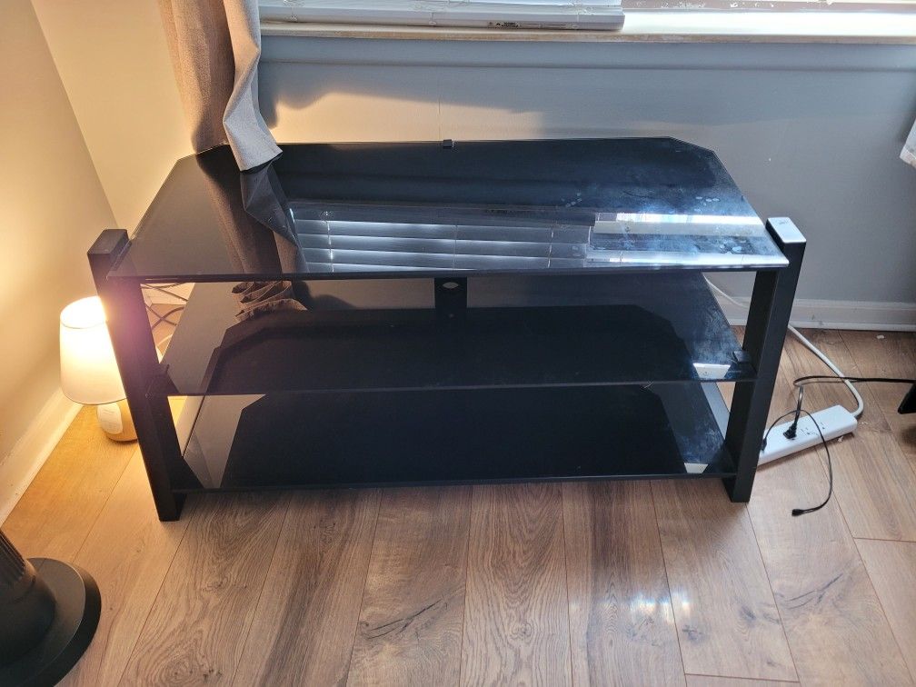 Thick, heavy black glass. No scratches. 3 shelves. The two bottom glass shelves come off. The top glass shelf stays on but use some small bungie cords to keep it in place while moving is recommended. 45 w x 21 length x 22 height