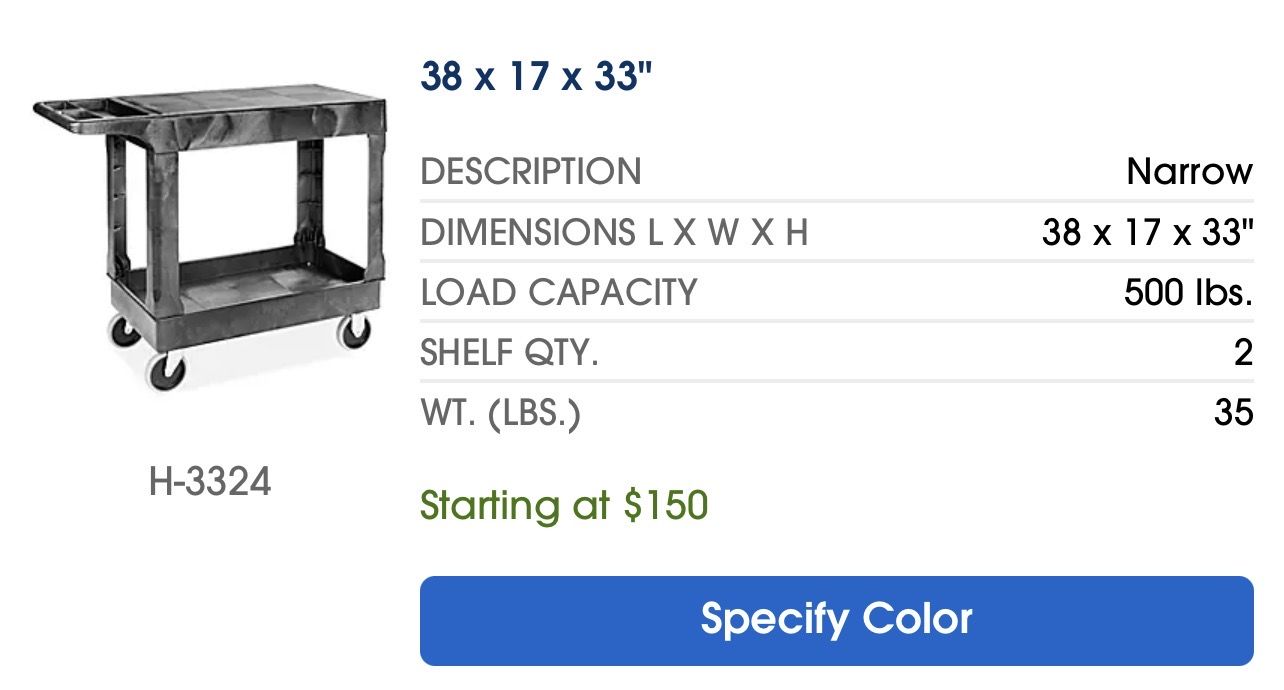 Load and unload oversized items easily. Top shelf doubles as a work surface. Non-marking 5" casters: 2 swivel, 2 rigid. Power Strip and Utility Hooks available.