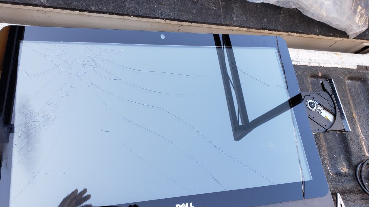 Dell desktop all in one with broken screen for parts only, has a CD-Rom, other parts may be missing, has power cord, and no stand.