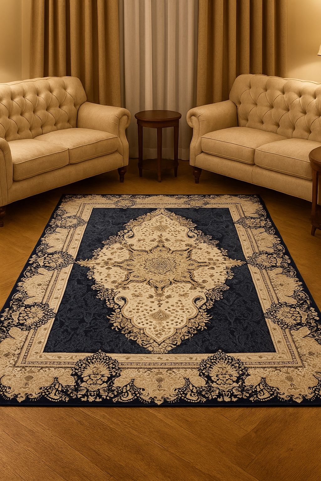 5x7 Navy Blue Persian Silk Pile Rug – Ivory Medallion Design Carpet