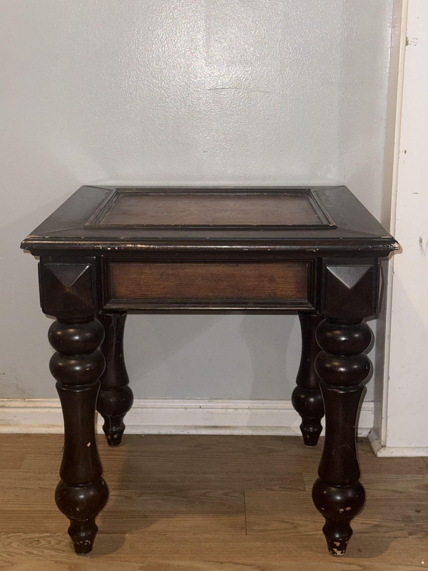 Wooden table extremely well made. Sturdy. Could be refinished if needed. Paid a couple hundred back in the day. Asking 40