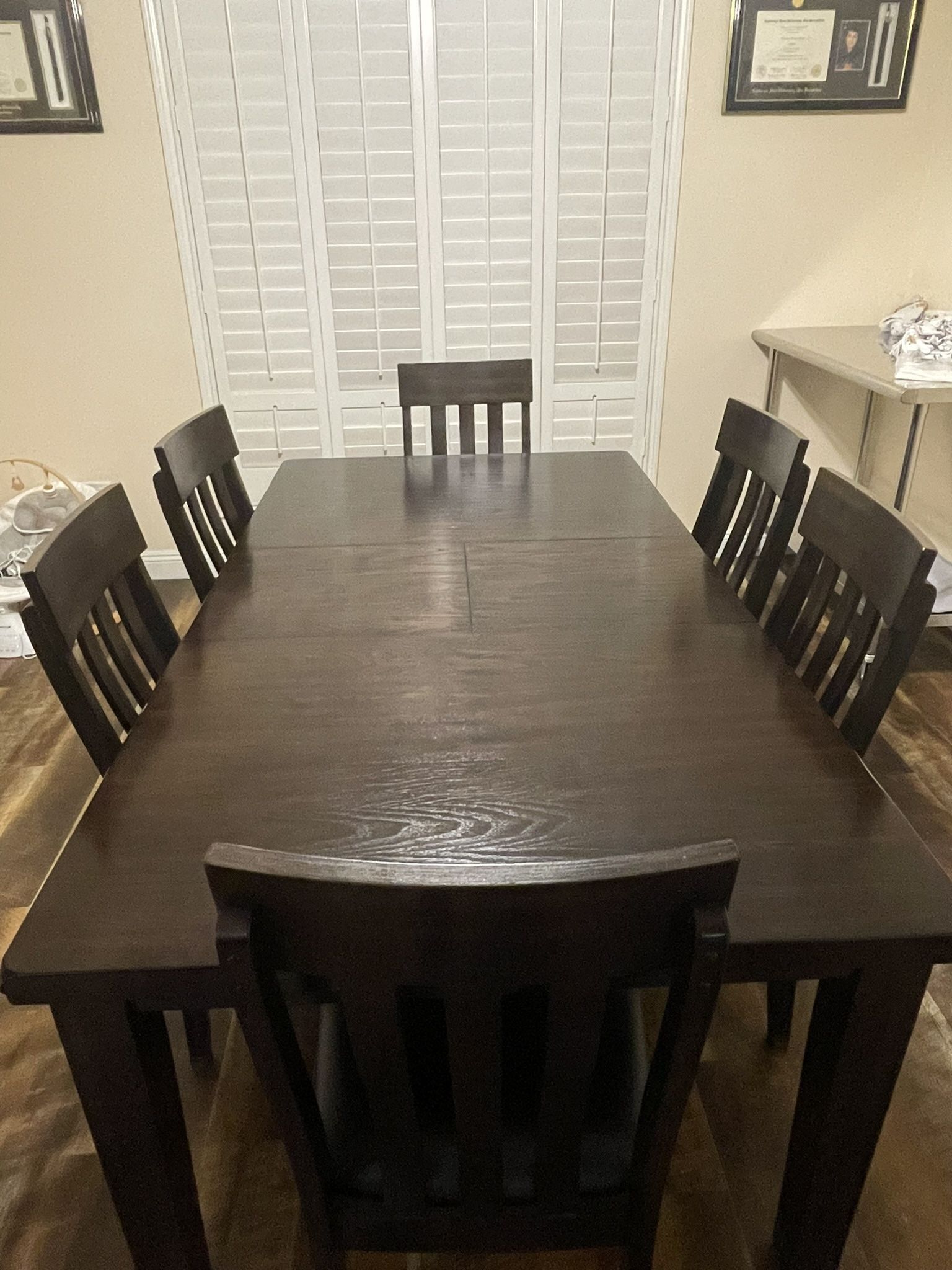 Used, good condition. 6 chairs, table has an extension leaf that can be stored inside the table if you want the table shorter. Picture taken with table fully extended.