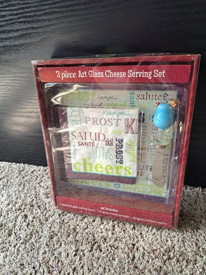 Brand new in packaging 3 piece art glass cheese serving set. Includes tempered glass cutting board, art glass cheese spreader and designer cocktail napkins. Cutting board is about 8 inches wide. Pick up in Wrightsville. Check out my other items as well! Party service wedding bridal shower friend gift unique cheese and crackers wine and cheese tasting date night in fun and different
