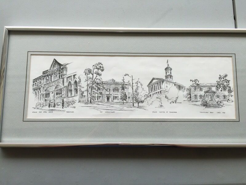 9 1/4" h x 20 w x 3/4 thick Aluminum frame Dual matts light gray with a 1/8" charcoal secondary matt The edges of the frame are brushed. Artist M M Speer 1974 Four pics in one Grand Ole Opry House The Hermitage State Capital of Tennessee and the Travelers' Rest Circa All items are first come, first serve basis & near by pick up ONLY.