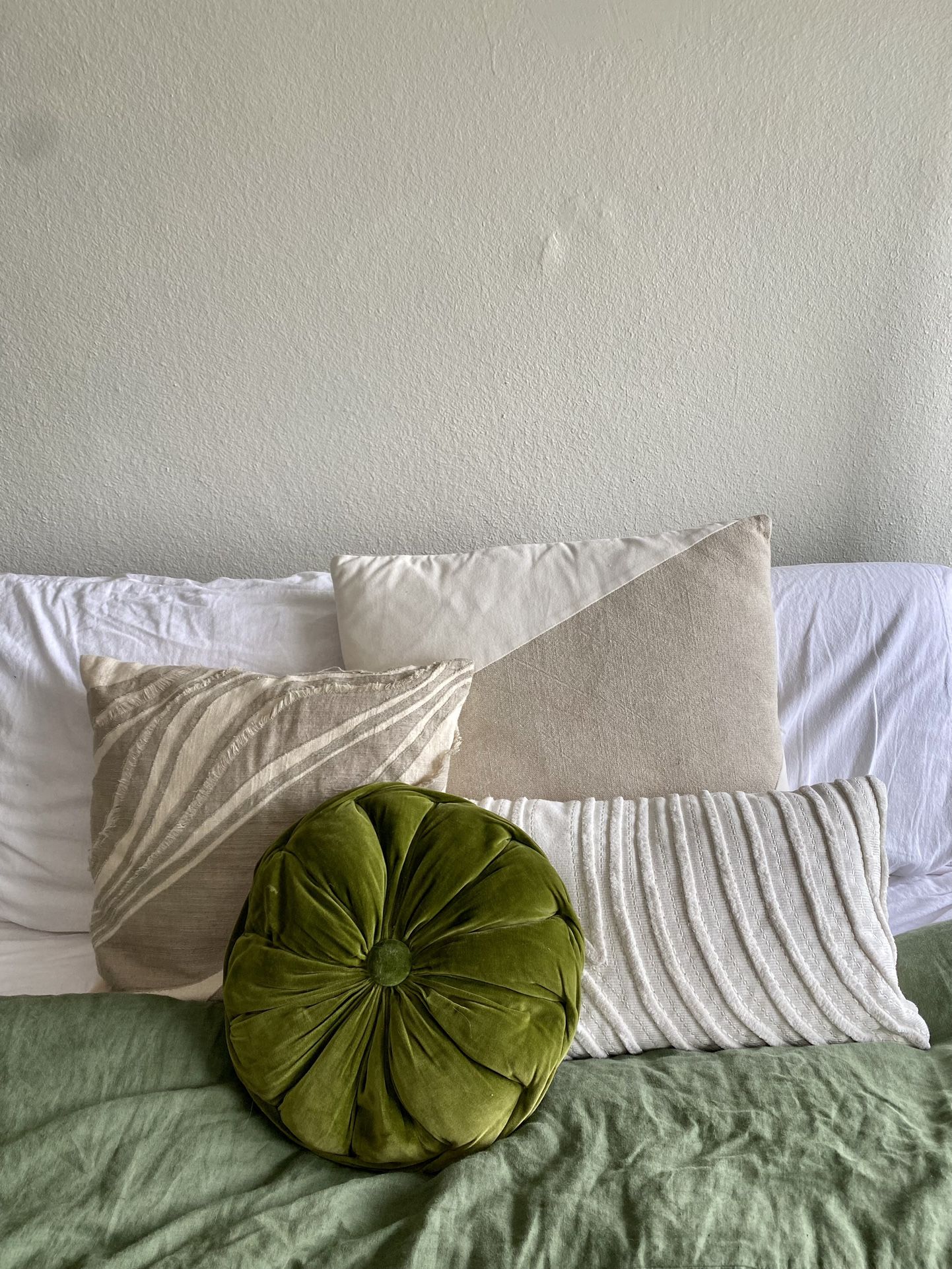 All items individually priced!! Also all items barely used and bought within the last year and a Vintage green velvet pillow: $30 Large white and beige West Elm pillow: $30 medium Tan and Gray West elm Pillow: $20 long white textured West Elm pillow: $25 All pillows together for $100