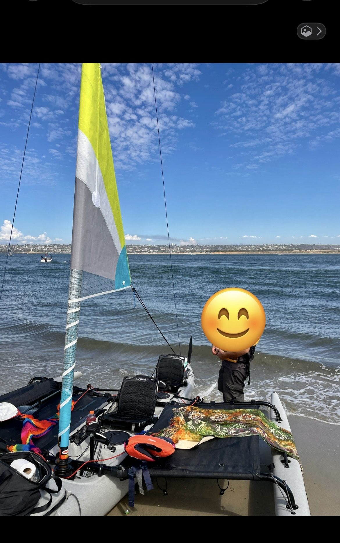 Lightly used in perfect condition purchased brand new Added features: spinnaker kit ($900 installed), cover, sand tires ($700 value) , 2 side trampolines ($600 value) . Trailer ($2,500 value) Hand truck for easy at home movements ($250 value), 2 sits, 2 paddles and 2 pedals for the kayak.