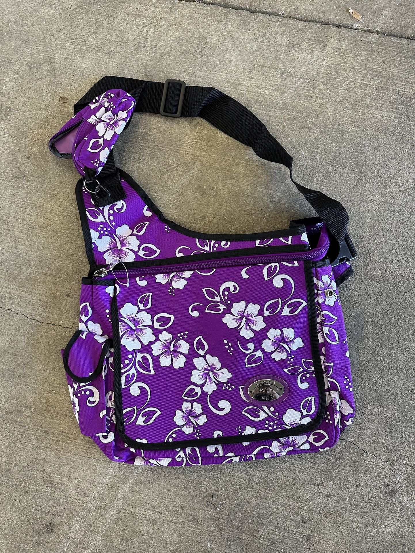 Never used - foot in one picture to give and example of size…. Middle pocket is the biggest and meant for laptop, which has a zipper to secure the pocket, but the flap then covers to close. There is another pocket in front for pens and some small office needs and a small mesh pocket on the outside of that. There is a cell phone case included but it is small and hands off the strap used to carry on shoulder or across chest, which is adjustable. Lightweight, colorful, never used and waiting for you to nab for your needs! Perfect for being able to spot your bag quickly to keep tabs on it and also perfect timing with summer coming up!